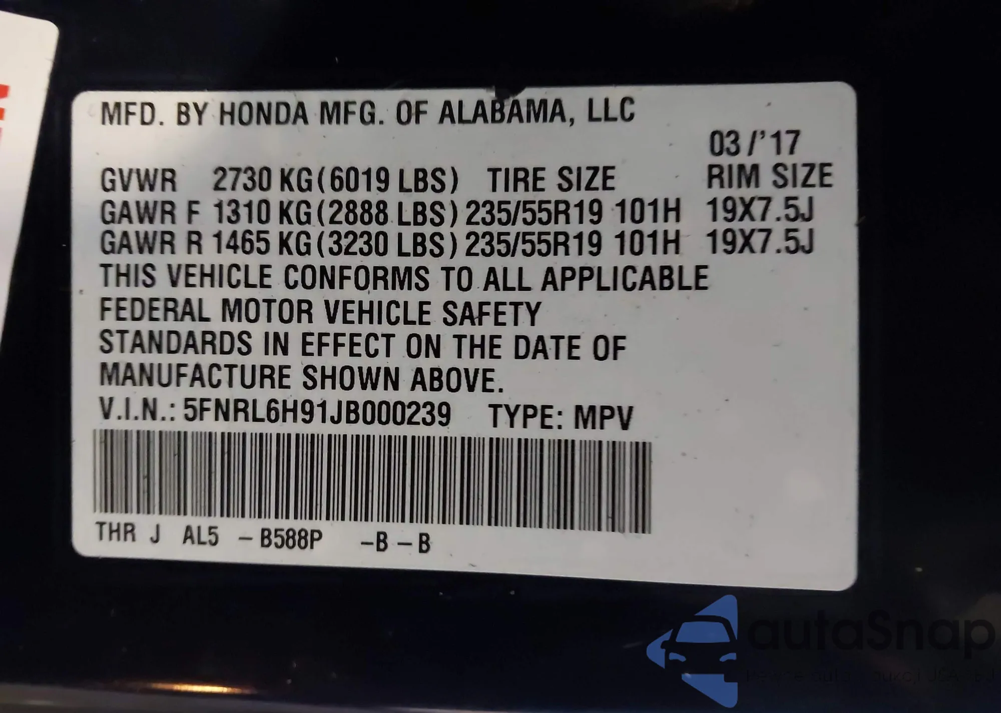 • VIN: 5FNRL6H91JB000239