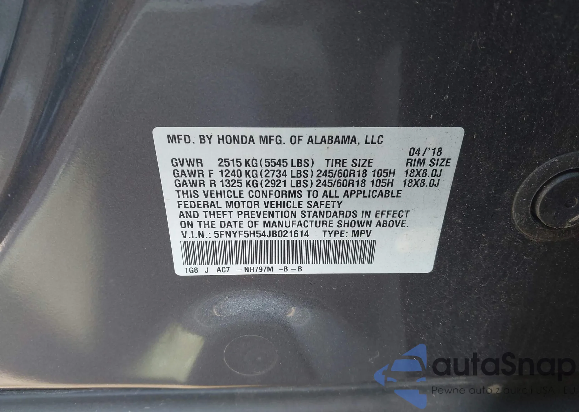 VIN: 5FNYF5H54JB021614