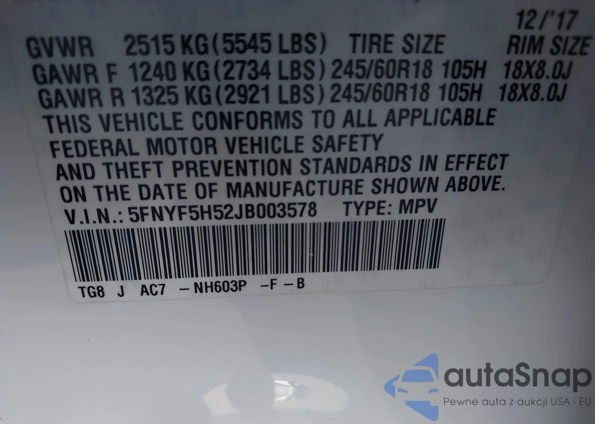 VIN: 5FNYF5H52JB003578