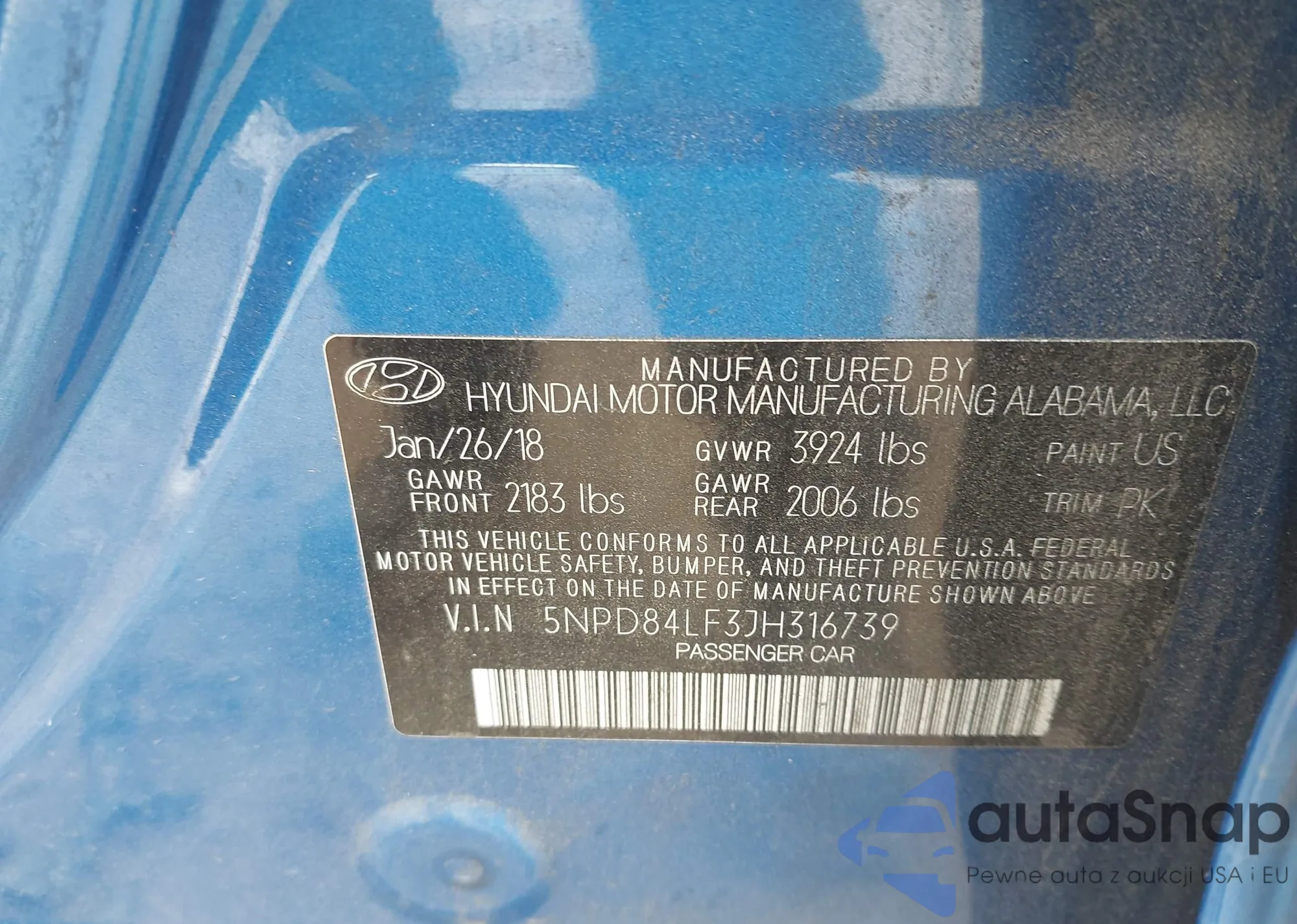 The car Hyundai Elantra 2018 (VIN 5NPD84LF3JH316739) has not been auctioned before. The documents are clean, and the mileage matches or is below the market average. Sold by an insurance company – we recommend purchase. Delivery to the port will take approx. 6–8 weeks.