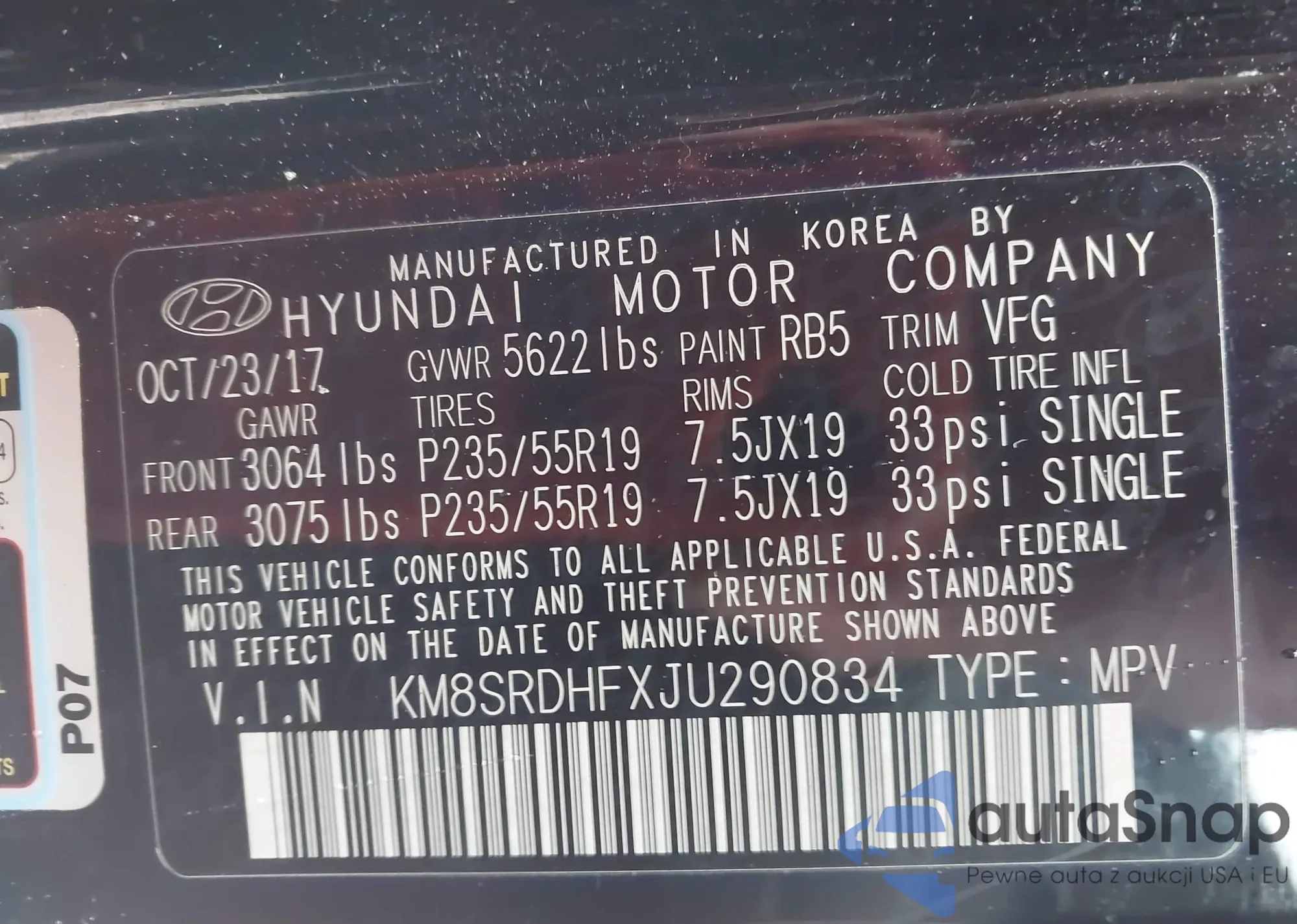 The car Hyundai Santa Fe 2018 (VIN KM8SRDHFXJU290834) has not been auctioned before. The documents are clean, and the mileage matches or is below the market average. Sold by an insurance company – we recommend purchase. Delivery to the port will take approx. 6–8 weeks.