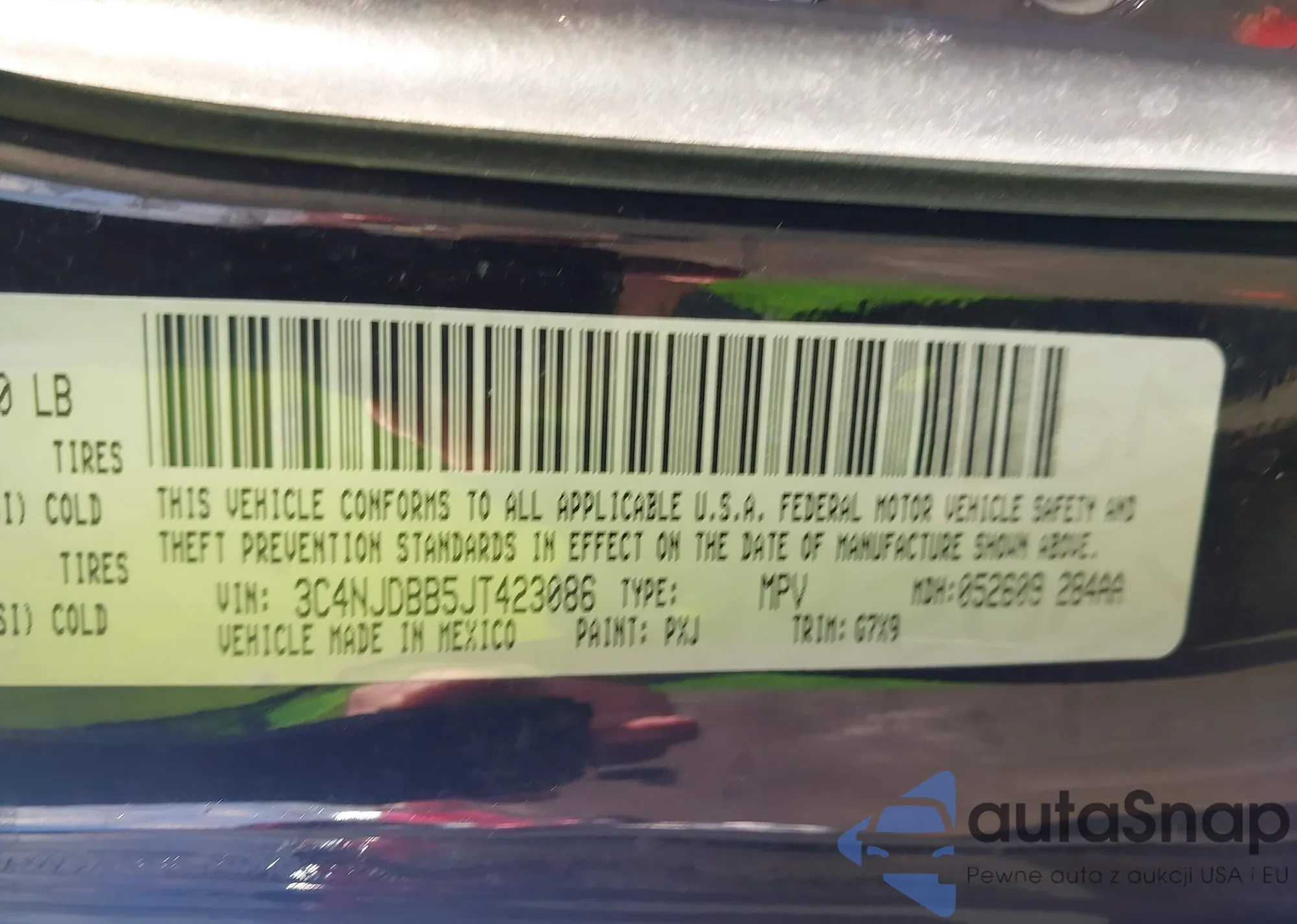 The car Jeep Compass 2018 (VIN 3C4NJDBB5JT423086) has not been auctioned before. The documents are clean, and the mileage matches or is below the market average. Sold by an insurance company – we recommend purchase. Delivery to the port will take approx. 6–8 weeks.