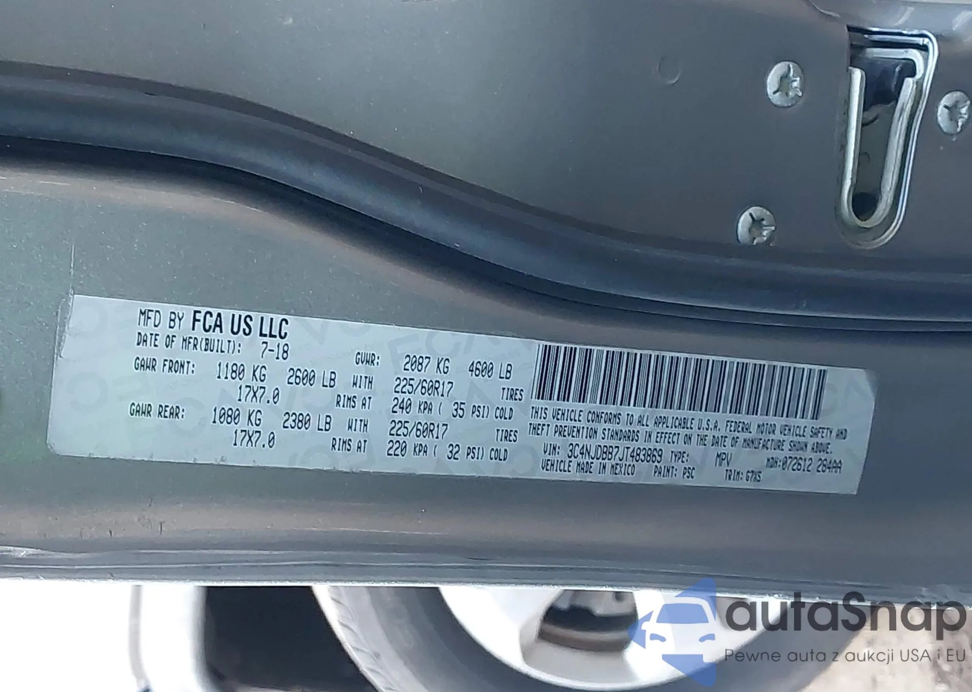 The car Jeep Compass 2018 (VIN 3C4NJDBB7JT483869) has not been auctioned before. The documents are clean, and the mileage matches or is below the market average. Sold by an insurance company – we recommend purchase. Delivery to the port will take approx. 6–8 weeks.