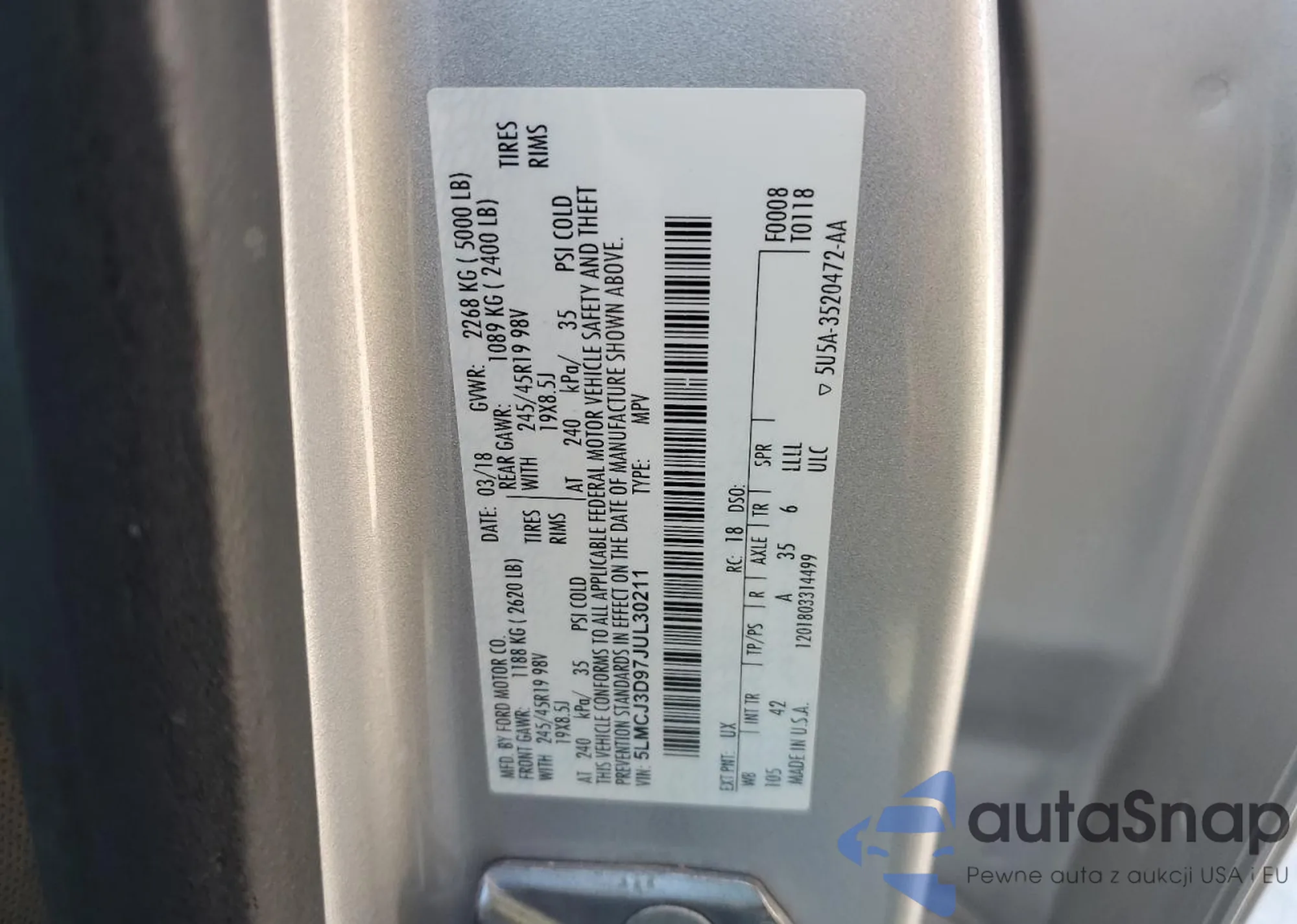 The car Lincoln MKC 2018 (VIN 5LMCJ3D97JUL30211) has already been auctioned 0 times or is sold by an unverified seller. We recommend checking the Carfax report and confirming registration possibilities before purchase.