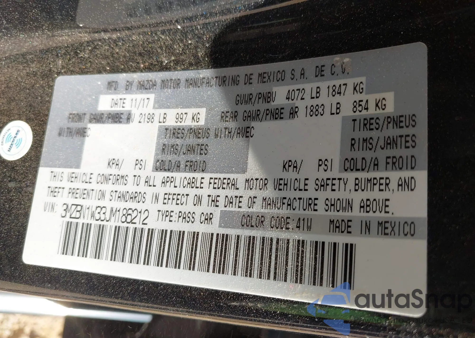 VIN: 3MZBN1W33JM186212