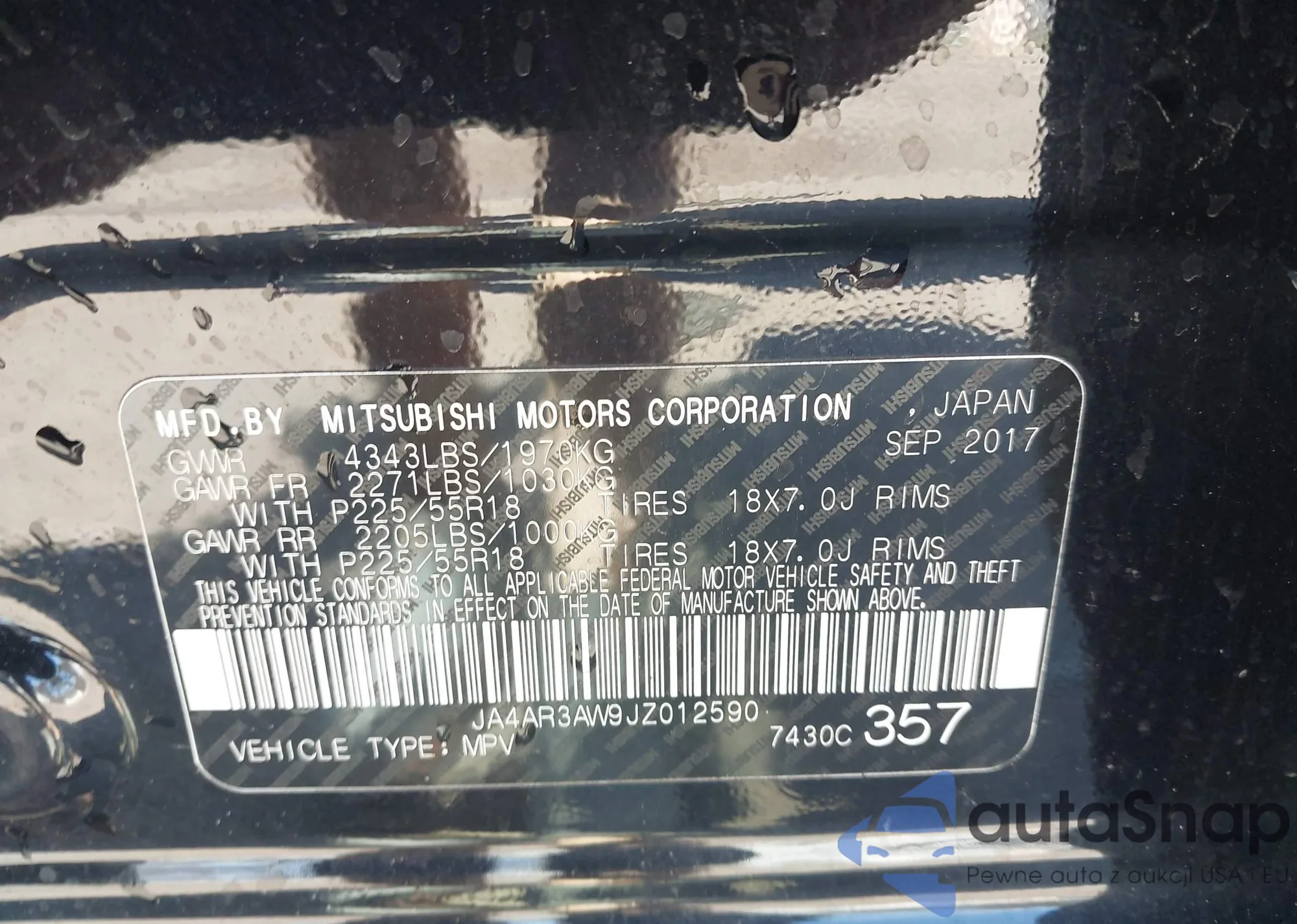 The car Mitsubishi Outlander 2018 (VIN JA4AR3AW9JZ012590) has not been auctioned before. The documents are clean, and the mileage matches or is below the market average. Sold by an insurance company – we recommend purchase. Delivery to the port will take approx. 6–8 weeks.