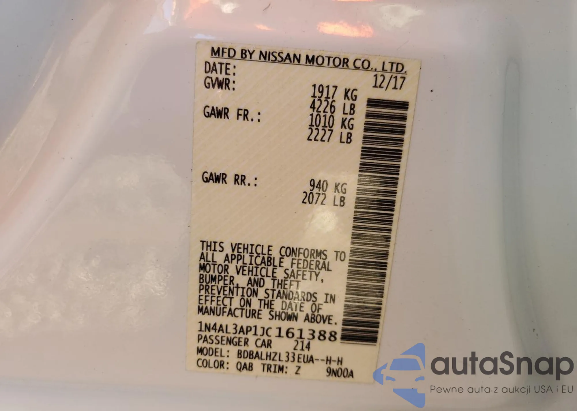 • VIN: 1N4AL3AP1JC161388