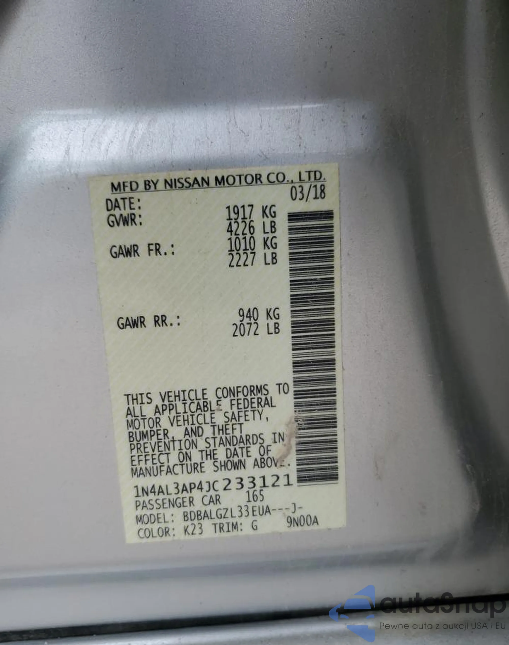 • VIN: 1N4AL3AP4JC233121