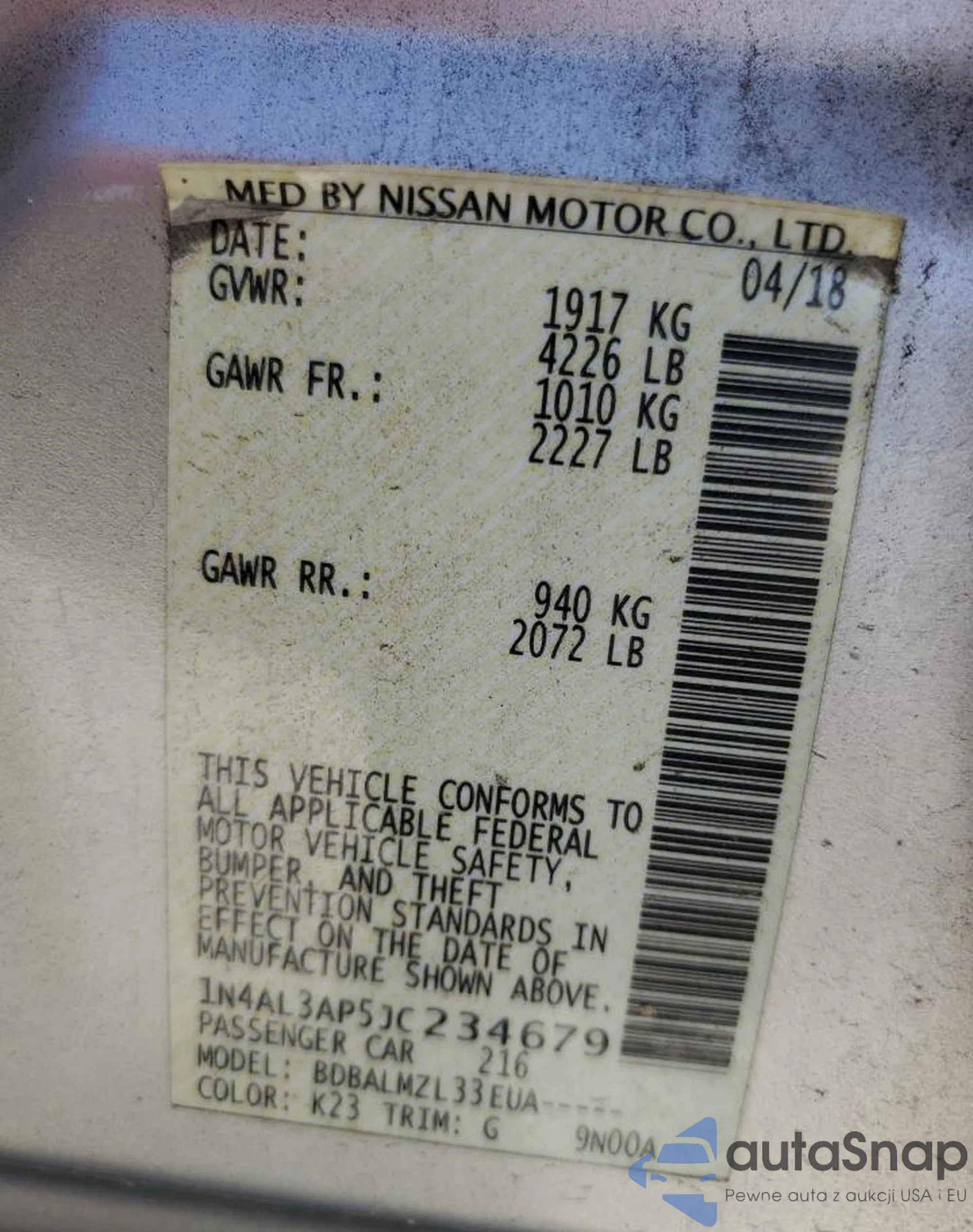 VIN: 1N4AL3AP5JC234679
