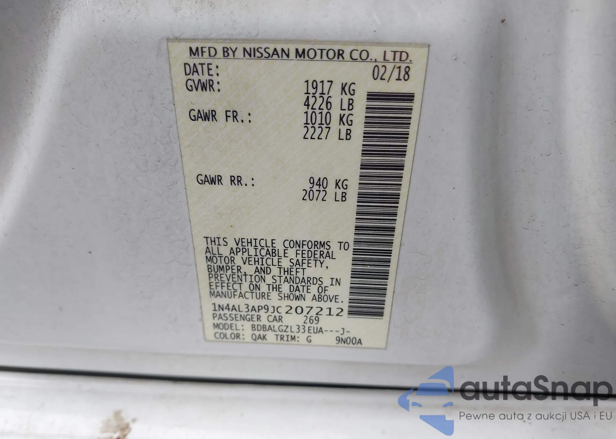 VIN: 1N4AL3AP9JC207212