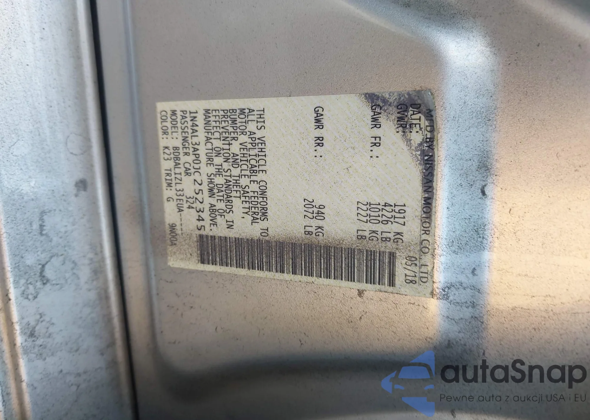 • VIN: 1N4AL3AP0JC252345