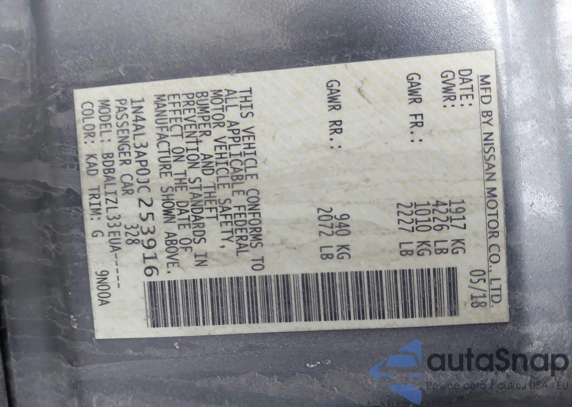 The car Nissan Altima 2018 (VIN 1N4AL3AP0JC253916) has not been auctioned before. The documents are clean, and the mileage matches or is below the market average. Sold by an insurance company – we recommend purchase. Delivery to the port will take approx. 6–8 weeks.