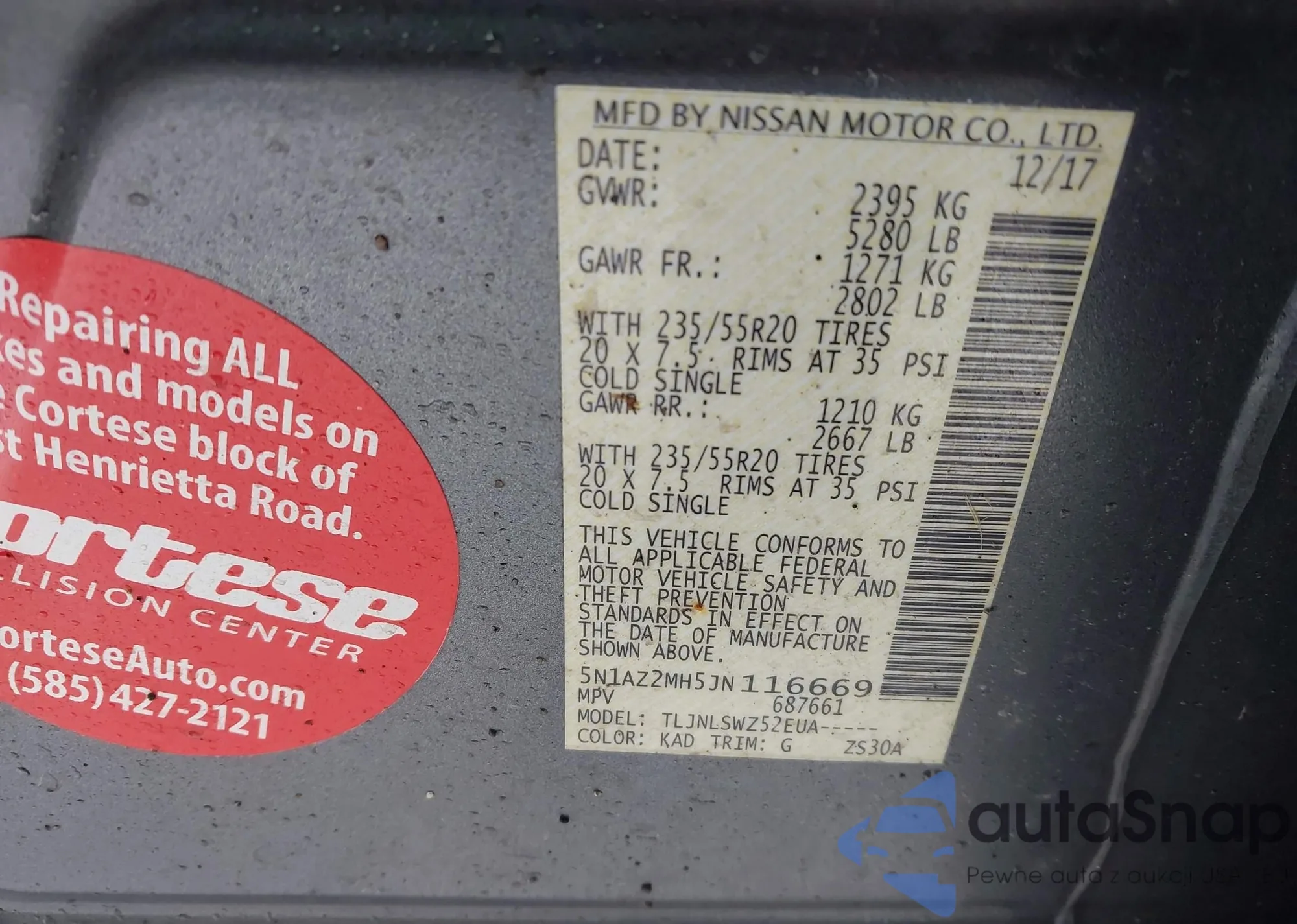 • VIN: 5N1AZ2MH5JN116669
