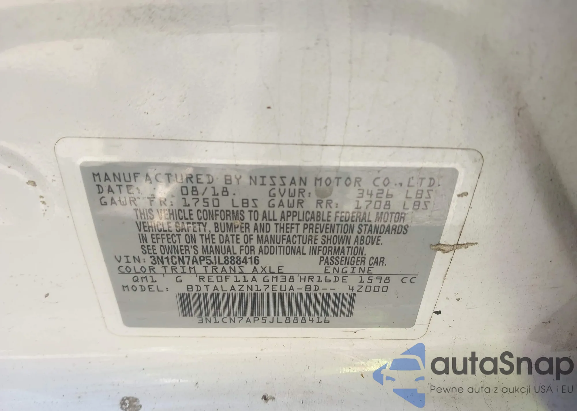 The car Nissan Versa 2018 (VIN 3N1CN7AP5JL888416) has not been auctioned before. The documents are clean, and the mileage matches or is below the market average. Sold by an insurance company – we recommend purchase. Delivery to the port will take approx. 6–8 weeks.