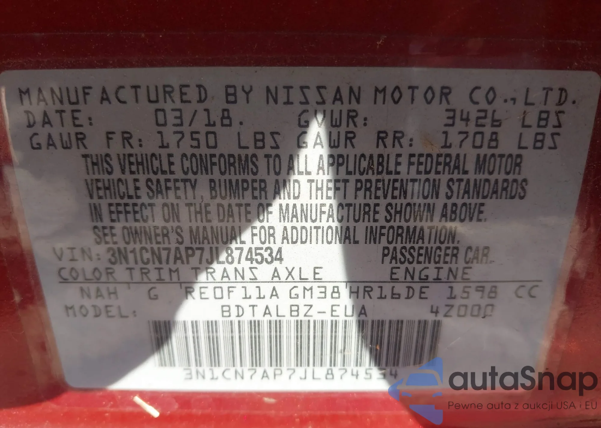 VIN: 3N1CN7AP7JL874534