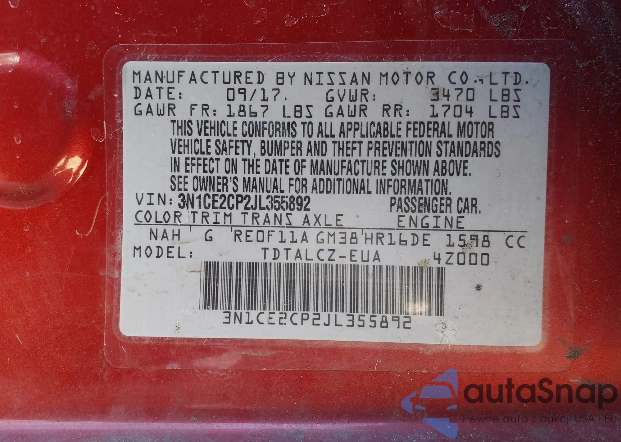 The car Nissan Versa 2018 (VIN 3N1CE2CP2JL355892) is sold by an unverified seller. We recommend checking the Carfax report and confirming registration possibilities before purchase.