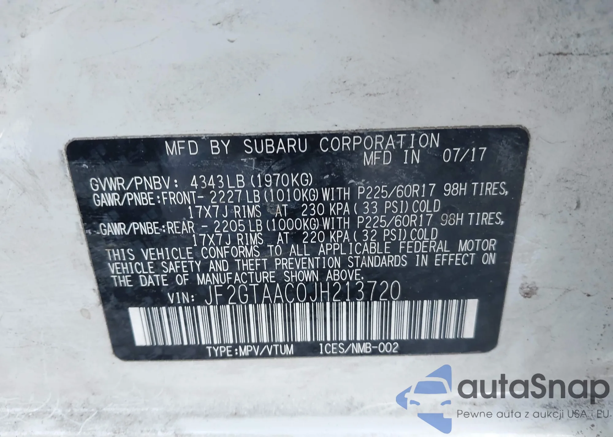 The car Subaru XV 2018 (VIN JF2GTAAC0JH213720) has not been auctioned before. The documents are clean, and the mileage matches or is below the market average. Sold by an insurance company – we recommend purchase. Delivery to the port will take approx. 6–8 weeks.