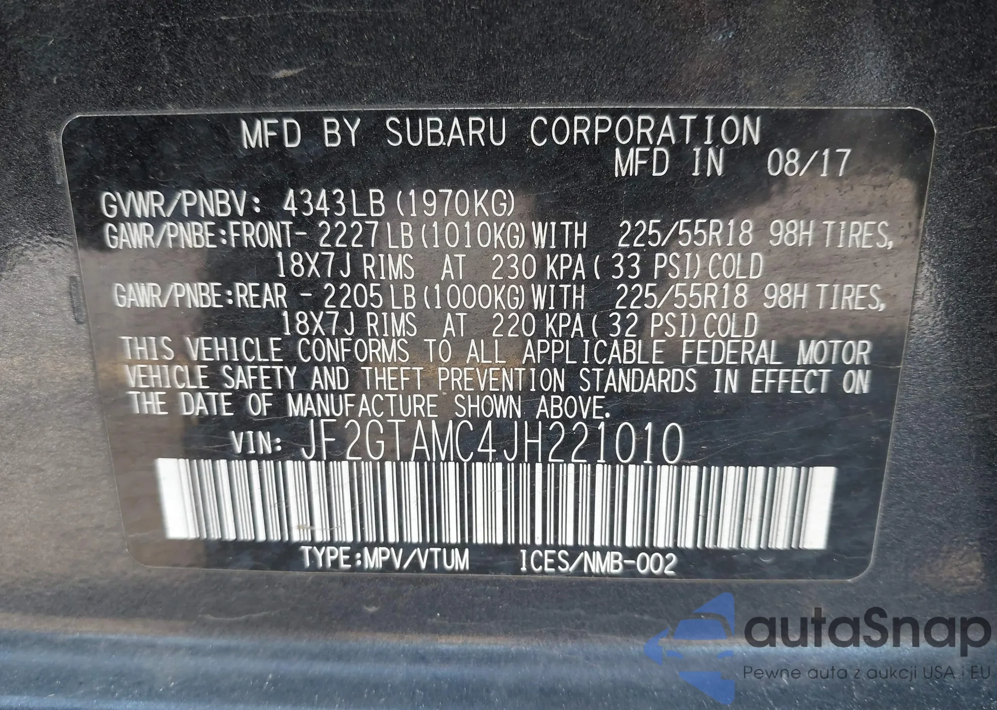 The car Subaru XV 2018 (VIN JF2GTAMC4JH221010) has not been auctioned before. The documents are clean, and the mileage matches or is below the market average. Sold by an insurance company – we recommend purchase. Delivery to the port will take approx. 6–8 weeks.