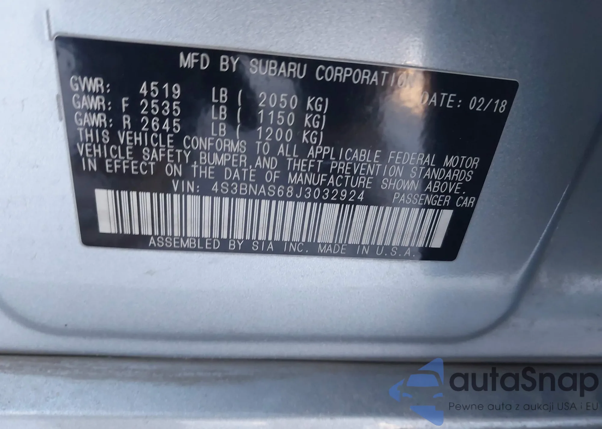 The car Subaru Legacy 2018 (VIN 4S3BNAS68J3032924) has not been auctioned before. The documents are clean, and the mileage matches or is below the market average. Sold by an insurance company – we recommend purchase. Delivery to the port will take approx. 6–8 weeks.