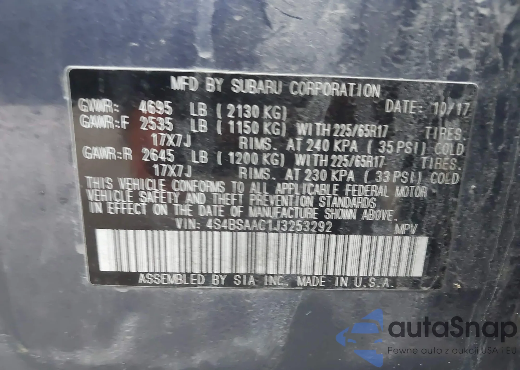 The car Subaru Outback 2018 (VIN 4S4BSAAC1J3253292) has not been auctioned before. The documents are clean, and the mileage matches or is below the market average. Sold by an insurance company – we recommend purchase. Delivery to the port will take approx. 6–8 weeks.
