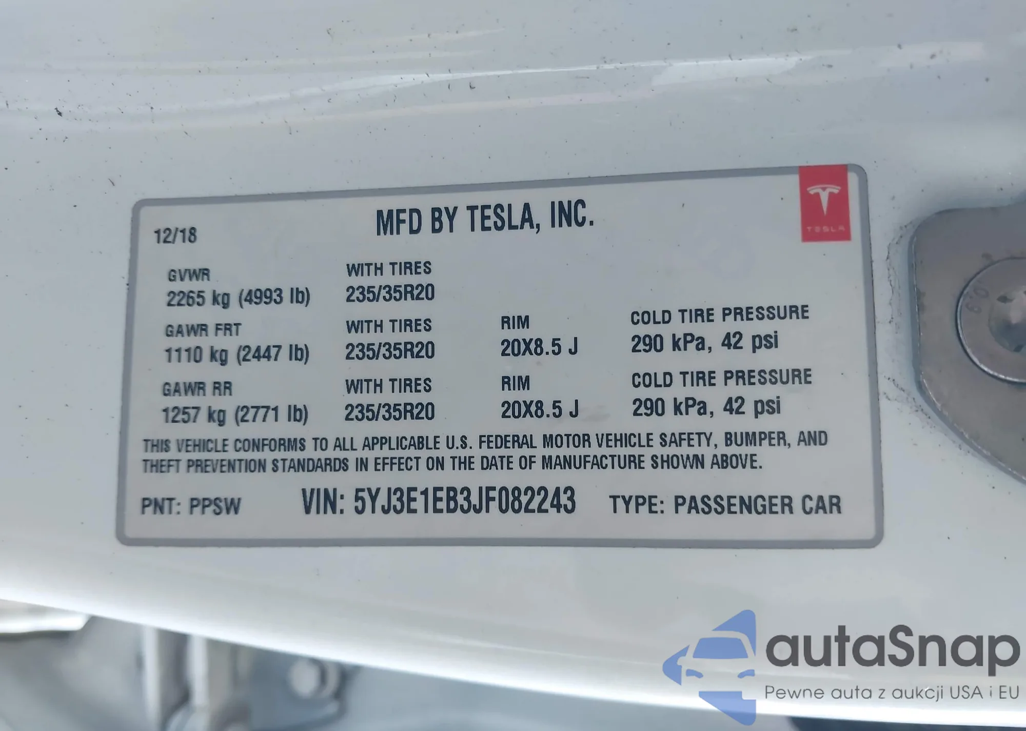 • VIN: 5YJ3E1EB3JF082243