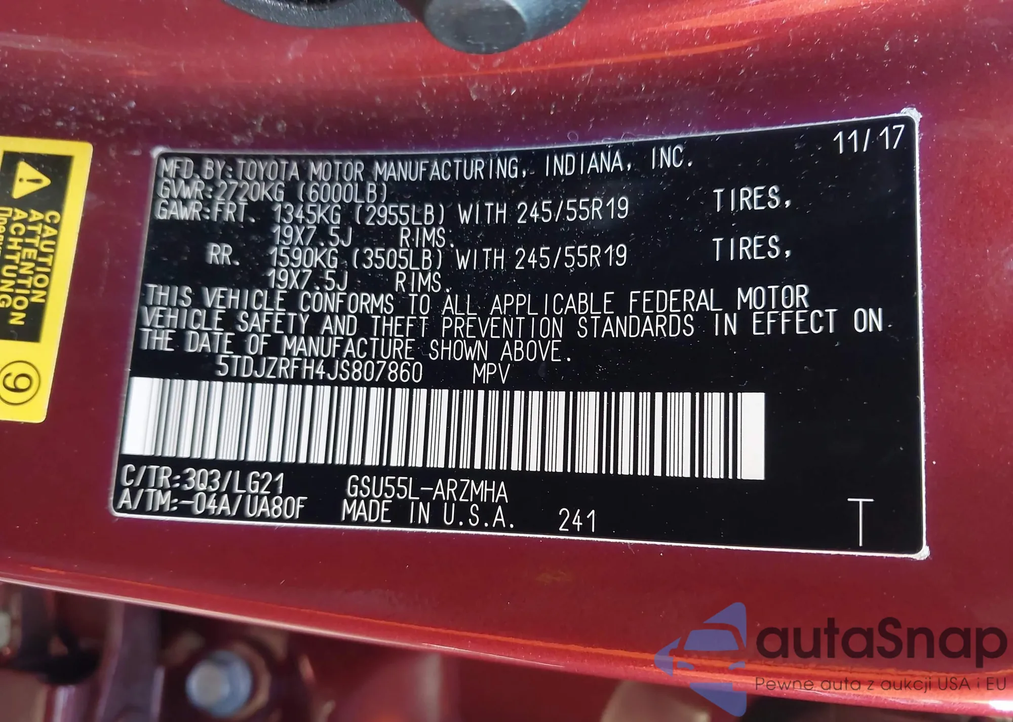 The car Toyota Highlander 2018 (VIN 5TDJZRFH4JS807860) has documents that prevent registration. Export and registration may be difficult. Contact AutaSnap experts to find alternatives.
