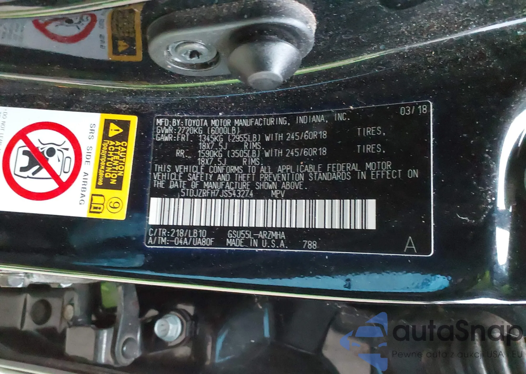 The car Toyota Highlander 2018 (VIN 5TDJZRFH7JS543274) has not been auctioned before. The documents are clean, and the mileage matches or is below the market average. Sold by an insurance company – we recommend purchase. Delivery to the port will take approx. 6–8 weeks.