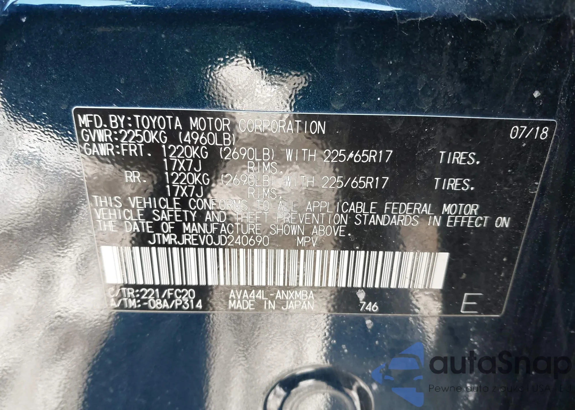 The car Toyota RAV 4 2018 (VIN JTMRJREV0JD240690) has not been auctioned before. The documents are clean, and the mileage matches or is below the market average. Sold by an insurance company – we recommend purchase. Delivery to the port will take approx. 6–8 weeks.