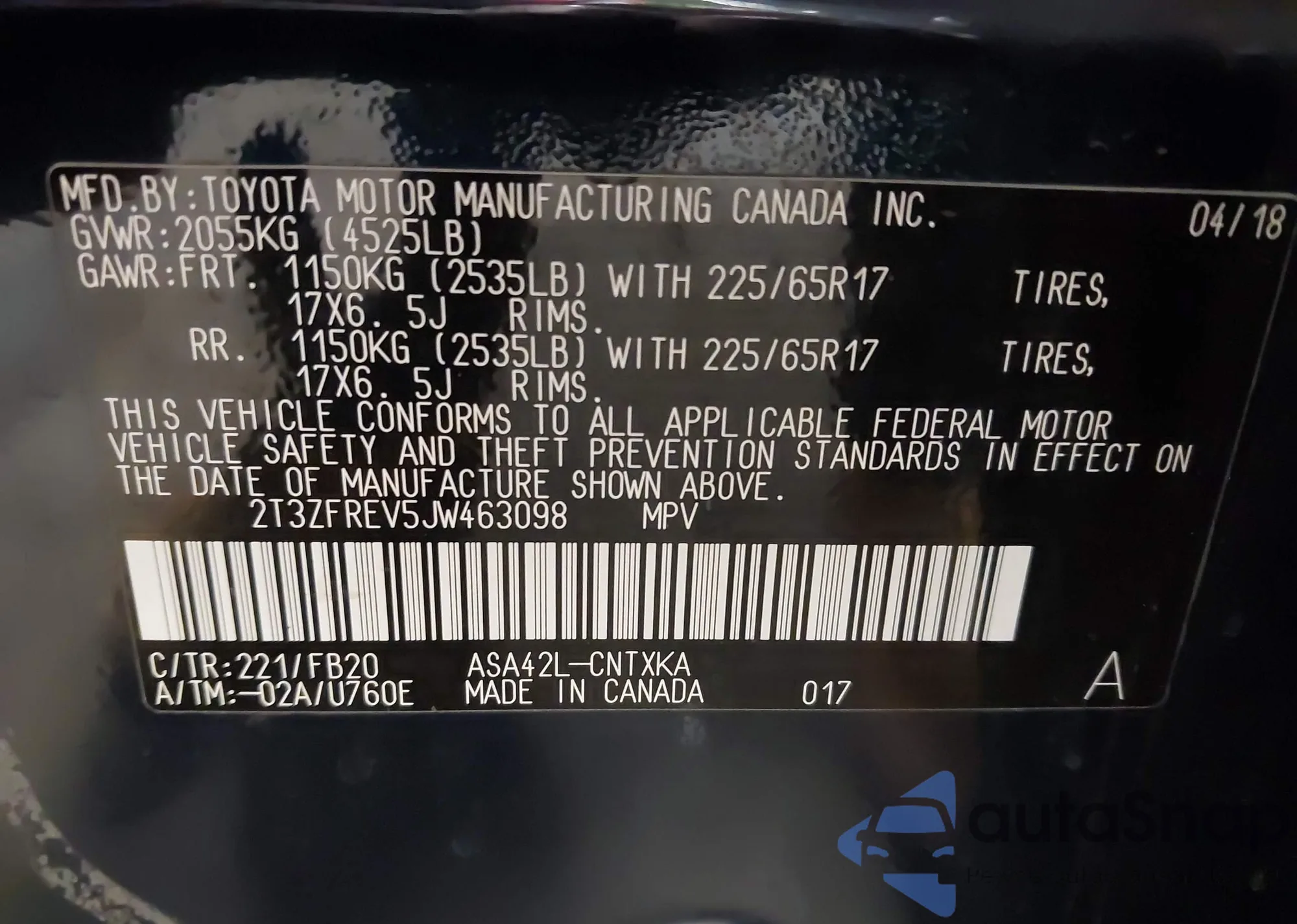 VIN: 2T3ZFREV5JW463098