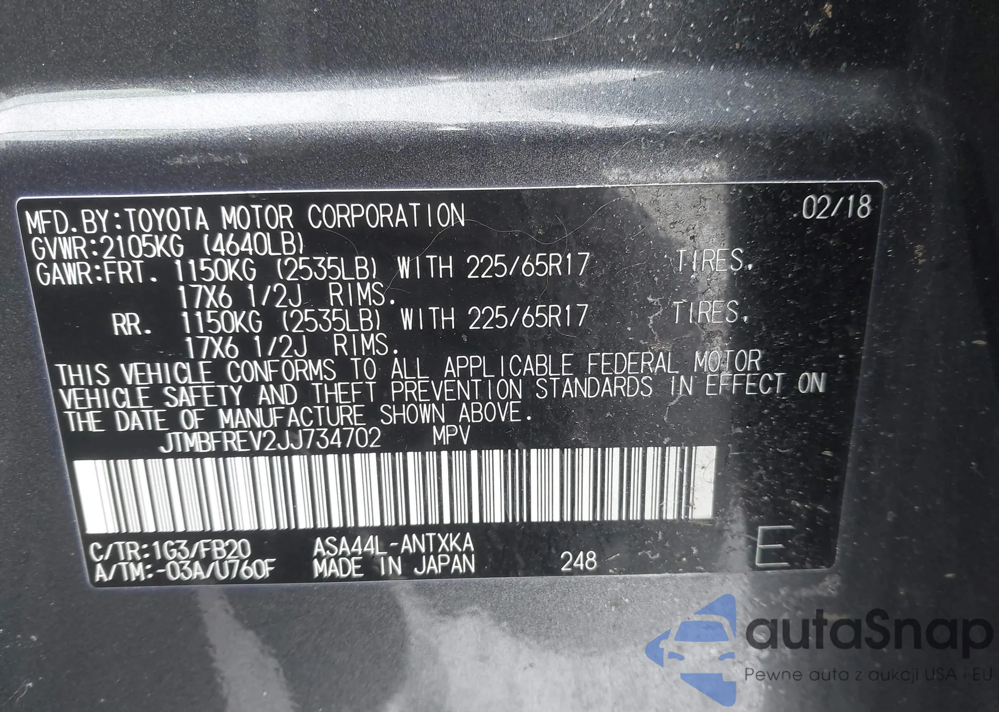 The car Toyota RAV 4 2018 (VIN JTMBFREV2JJ734702) has not been auctioned before. The documents are clean, and the mileage matches or is below the market average. Sold by an insurance company – we recommend purchase. Delivery to the port will take approx. 6–8 weeks.
