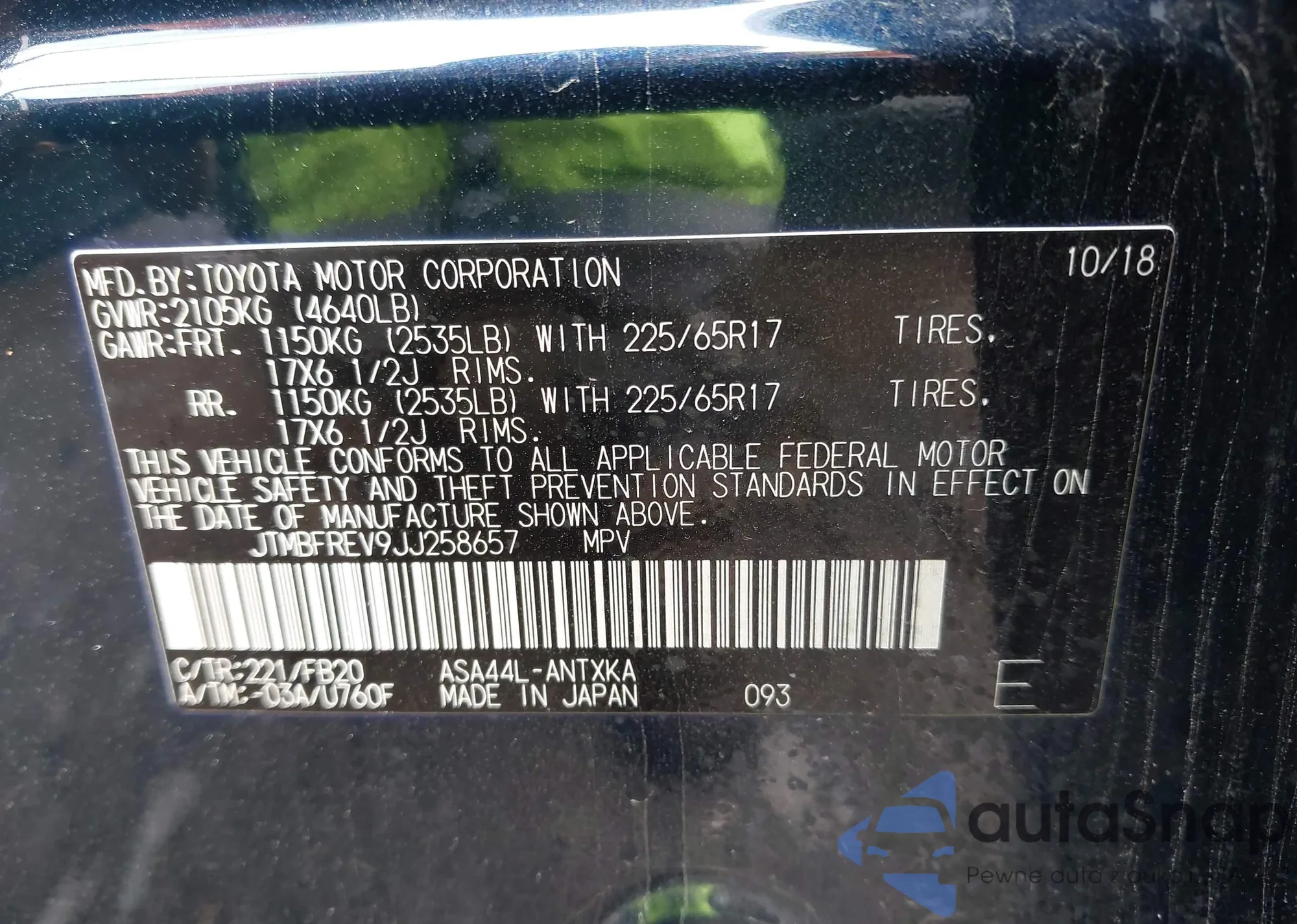 • VIN: JTMBFREV9JJ258657