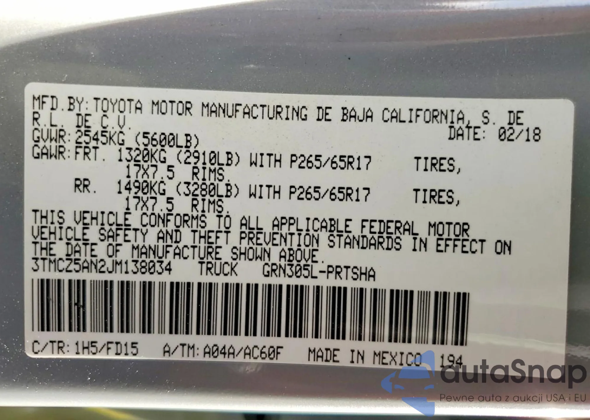 The car Toyota Tacoma 2018 (VIN 3TMCZ5AN2JM138034) is sold by an unverified seller. We recommend checking the Carfax report and confirming registration possibilities before purchase.