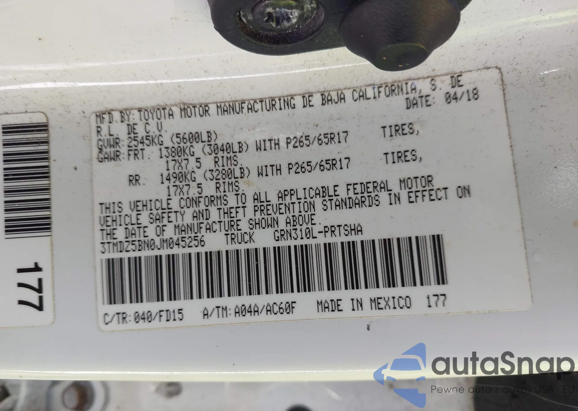 The car Toyota Tacoma 2018 (VIN 3TMDZ5BN0JM045256) has not been auctioned before. The documents are clean, and the mileage matches or is below the market average. Sold by an insurance company – we recommend purchase. Delivery to the port will take approx. 6–8 weeks.