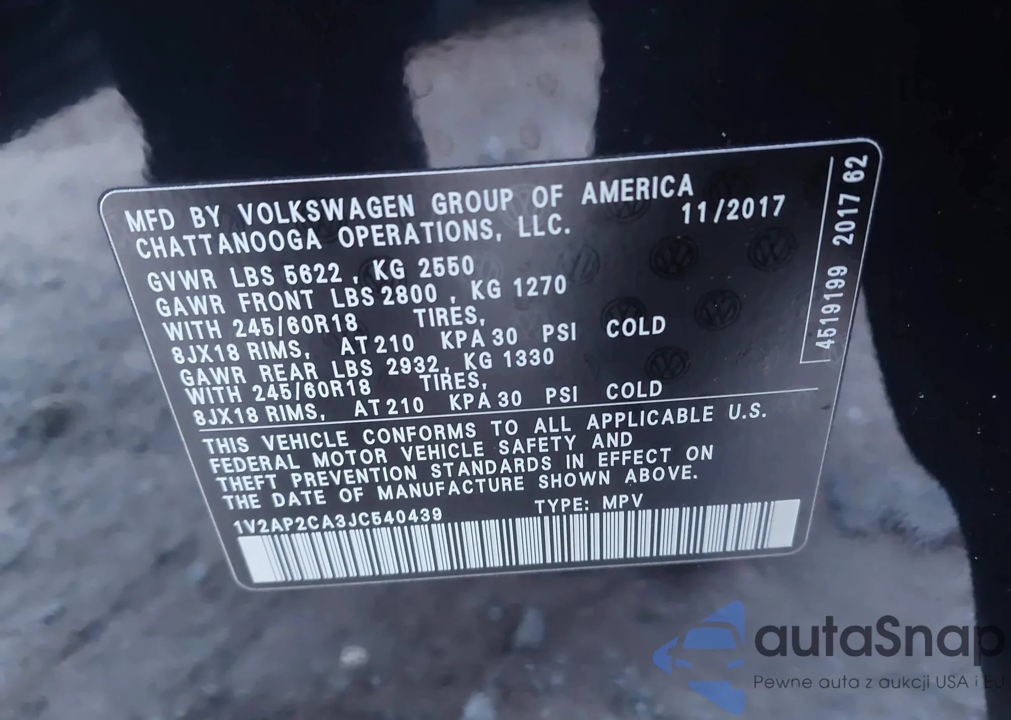 The car Volkswagen Atlas 2018 (VIN 1V2AP2CA3JC540439) has not been auctioned before. The documents are clean, and the mileage matches or is below the market average. Sold by an insurance company – we recommend purchase. Delivery to the port will take approx. 6–8 weeks.