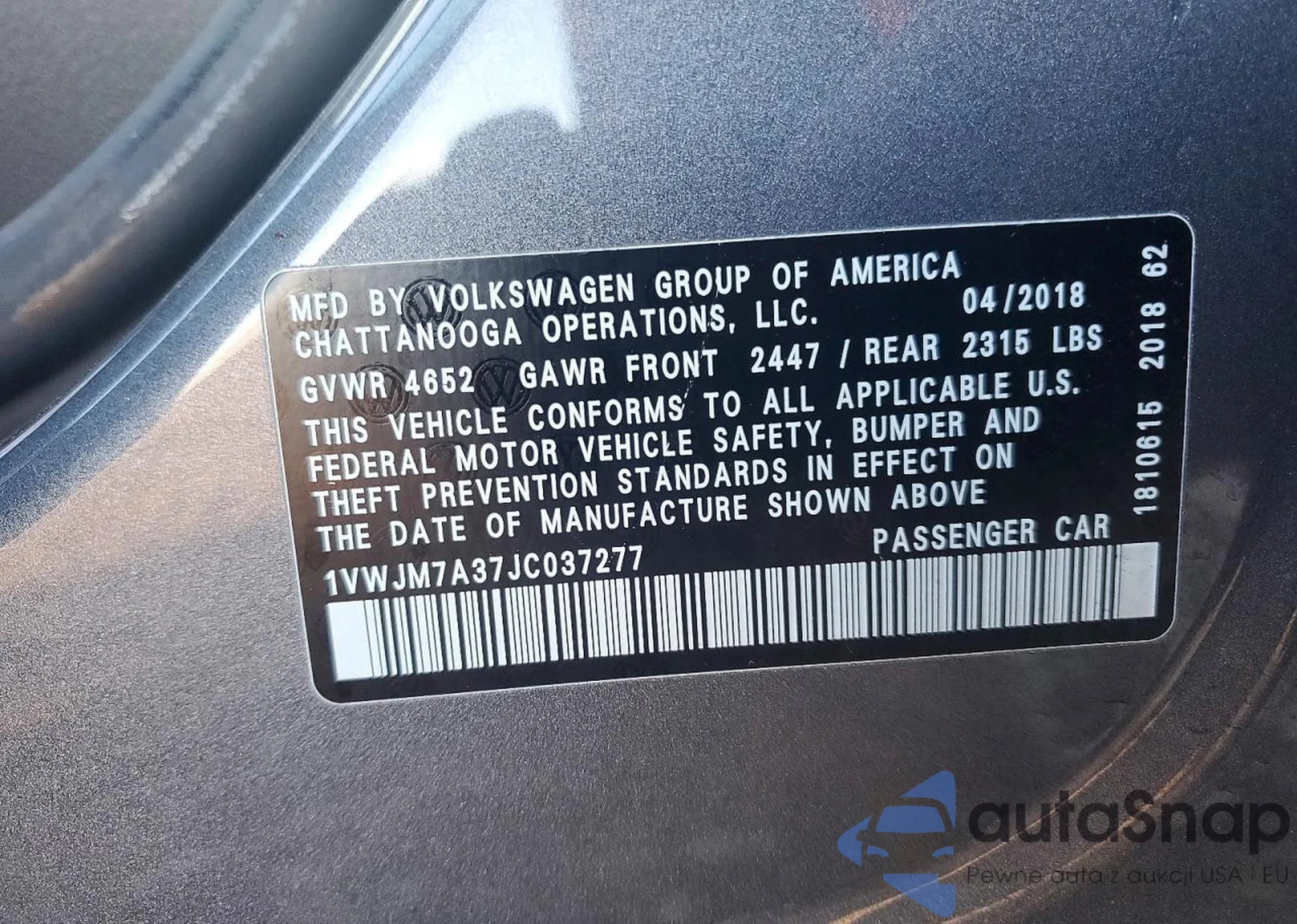 The car Volkswagen Passat 2018 (VIN 1VWJM7A37JC037277) has not been auctioned before. The documents are clean, and the mileage matches or is below the market average. Sold by an insurance company – we recommend purchase. Delivery to the port will take approx. 6–8 weeks.