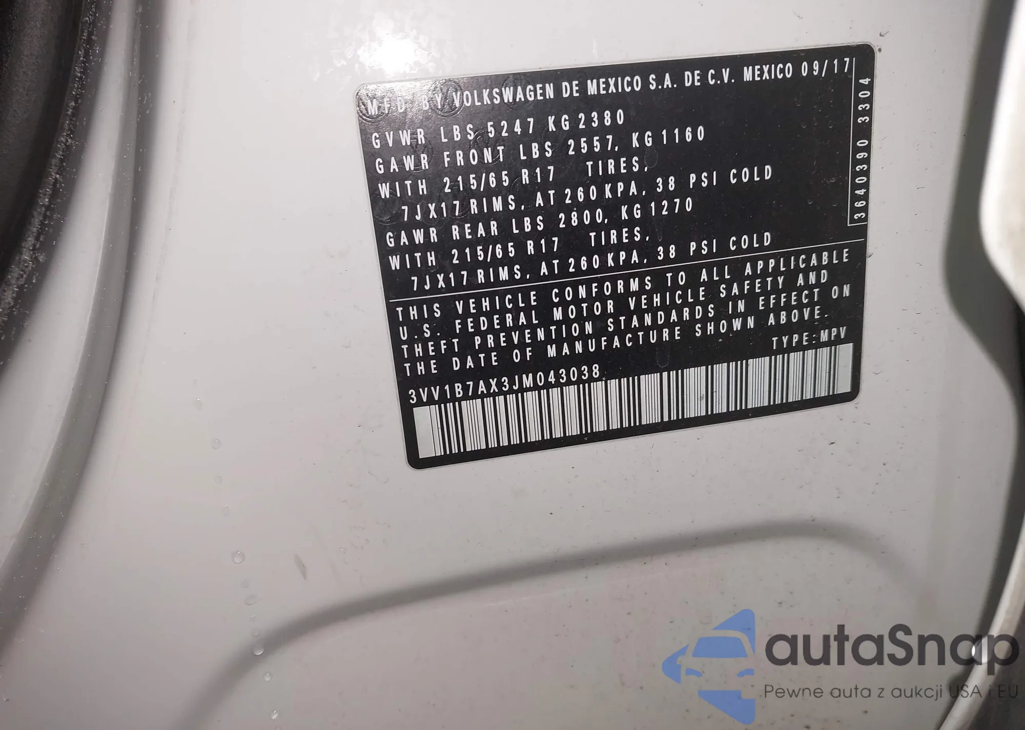 The car Volkswagen Tiguan 2018 (VIN 3VV1B7AX3JM043038) has not been auctioned before. The documents are clean, and the mileage matches or is below the market average. Sold by an insurance company – we recommend purchase. Delivery to the port will take approx. 6–8 weeks.