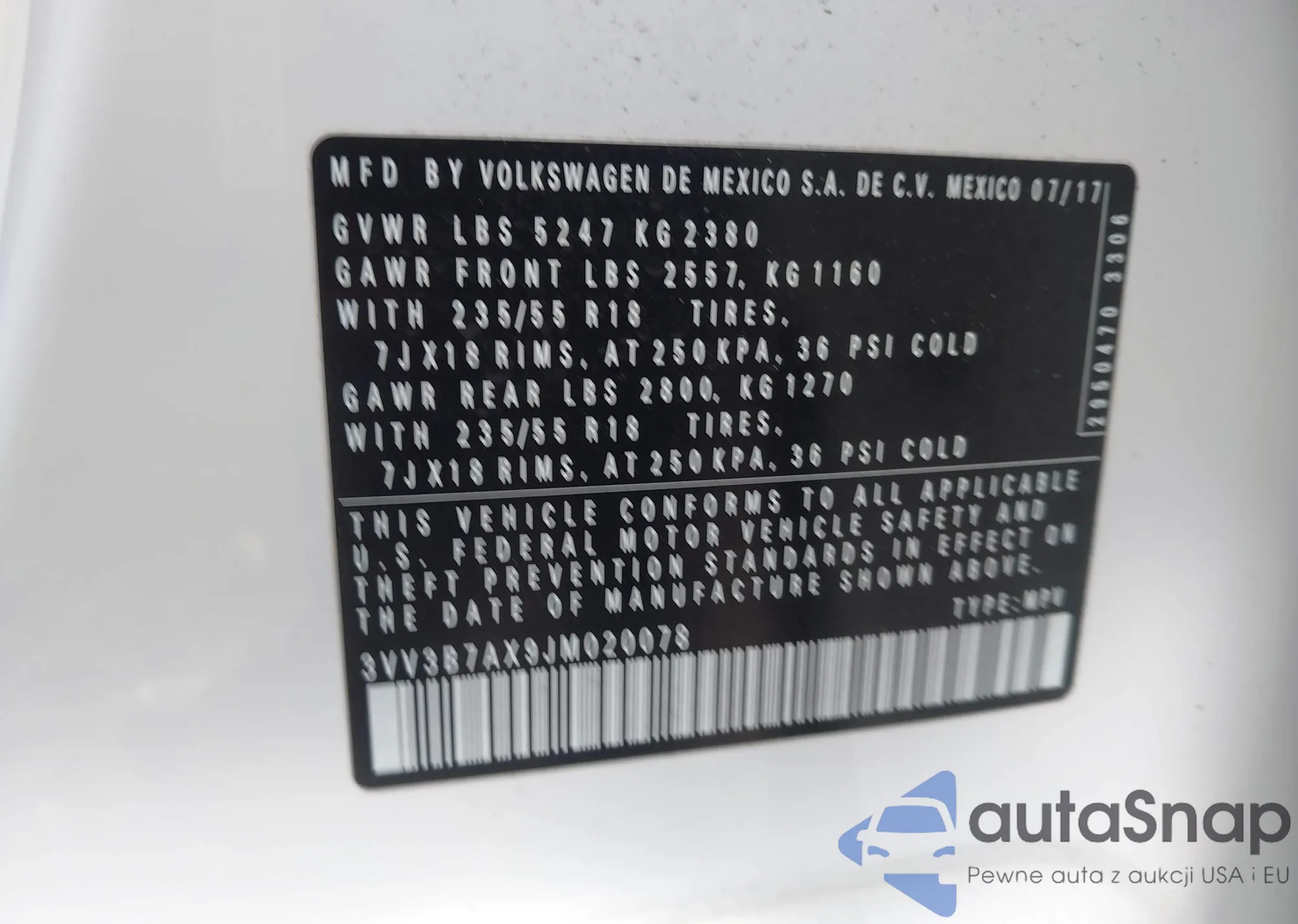 The car Volkswagen Tiguan 2018 (VIN 3VV3B7AX9JM020078) has not been auctioned before. The documents are clean, and the mileage matches or is below the market average. Sold by an insurance company – we recommend purchase. Delivery to the port will take approx. 6–8 weeks.