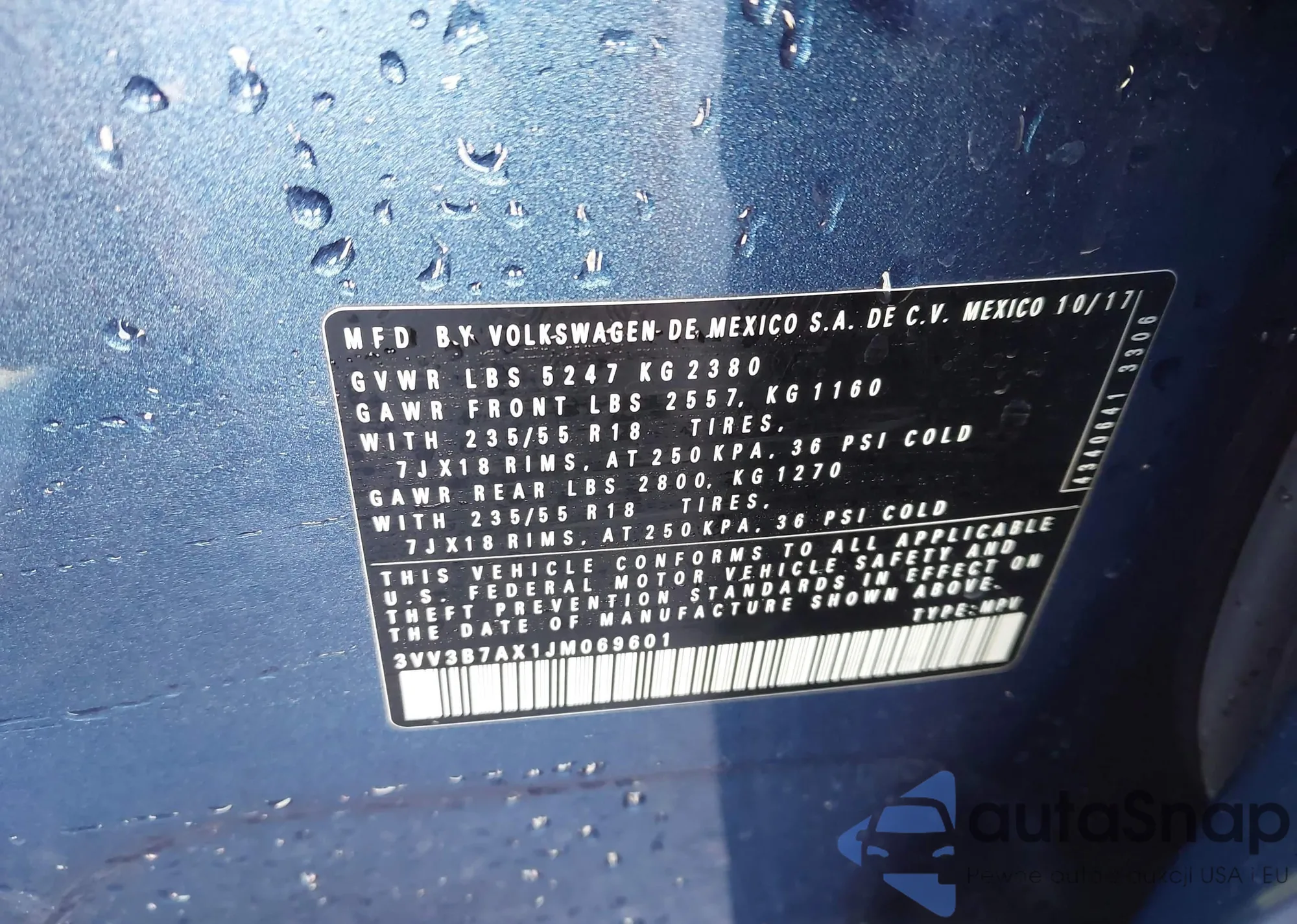 The car Volkswagen Tiguan 2018 (VIN 3VV3B7AX1JM069601) has not been auctioned before. The documents are clean, and the mileage matches or is below the market average. Sold by an insurance company – we recommend purchase. Delivery to the port will take approx. 6–8 weeks.