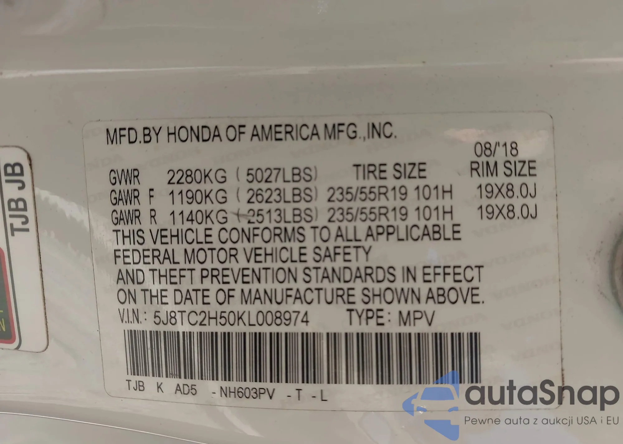The car Acura RDX 2019 (VIN 5J8TC2H50KL008974) has not been auctioned before. The documents are clean, and the mileage matches or is below the market average. Sold by an insurance company – we recommend purchase. Delivery to the port will take approx. 6–8 weeks.