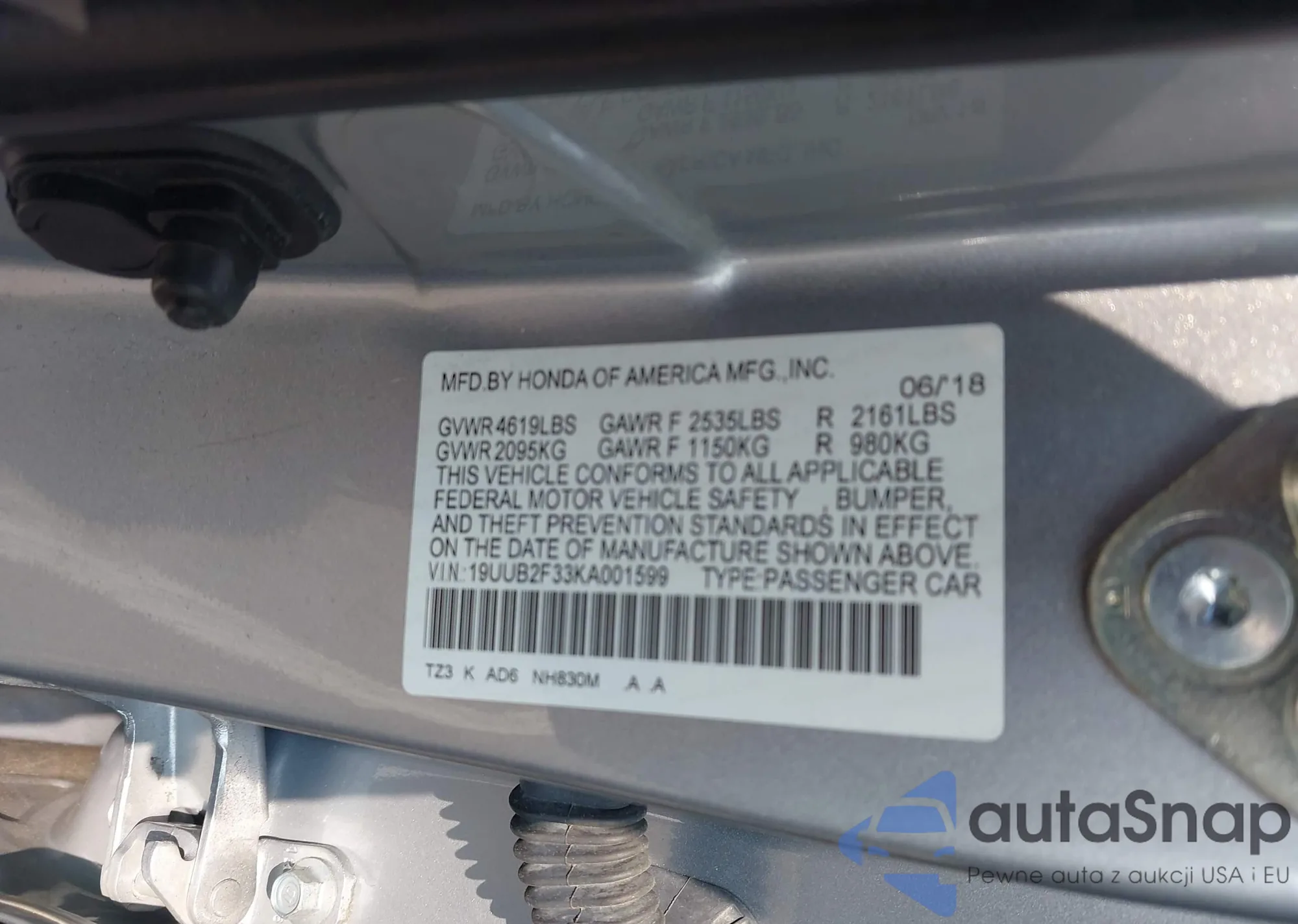 • VIN: 19UUB2F33KA001599