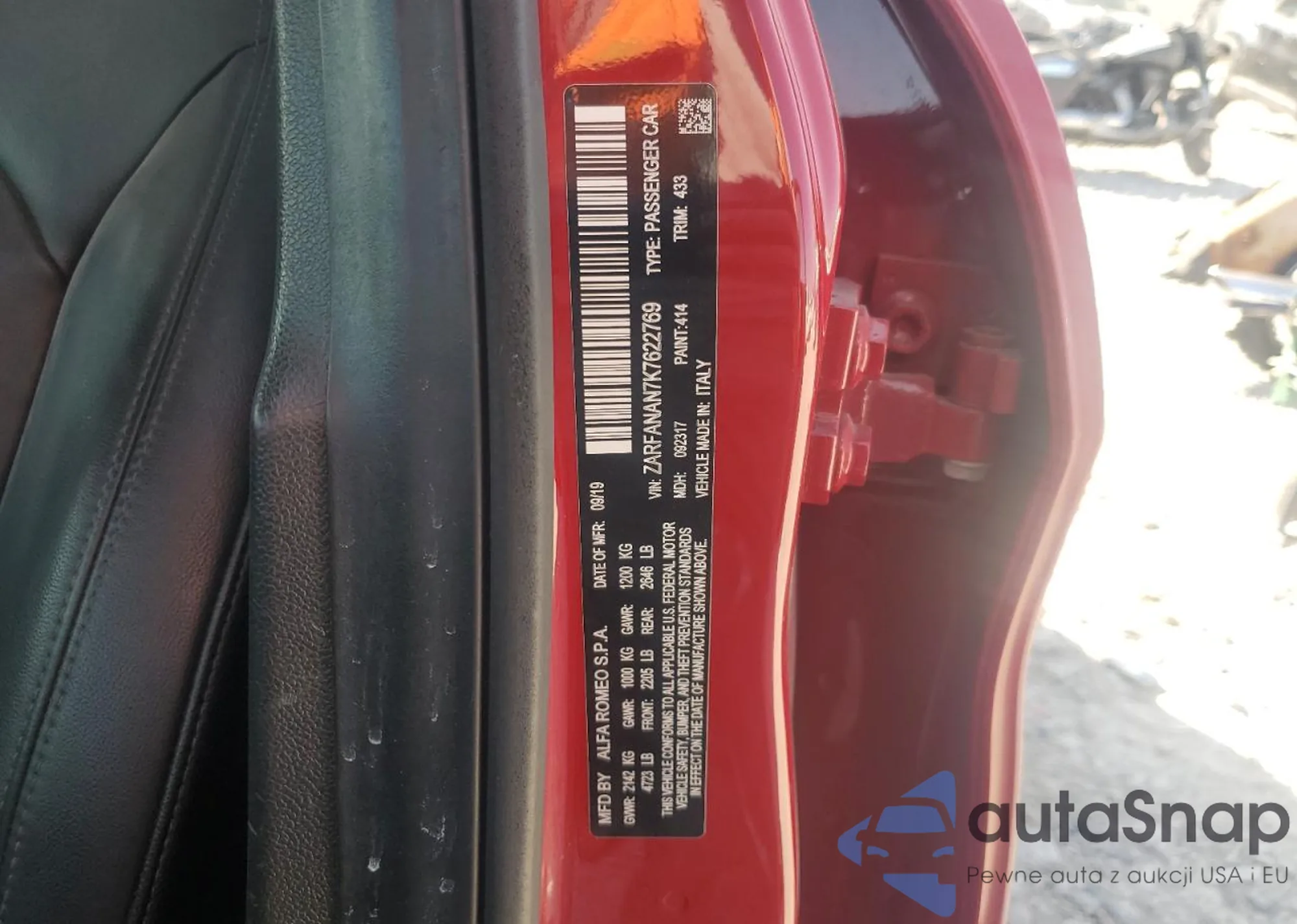 The car Alfa Romeo Giulia 2019 (VIN ZARFANAN7K7622769) is sold by an unverified seller. We recommend checking the Carfax report and confirming registration possibilities before purchase.