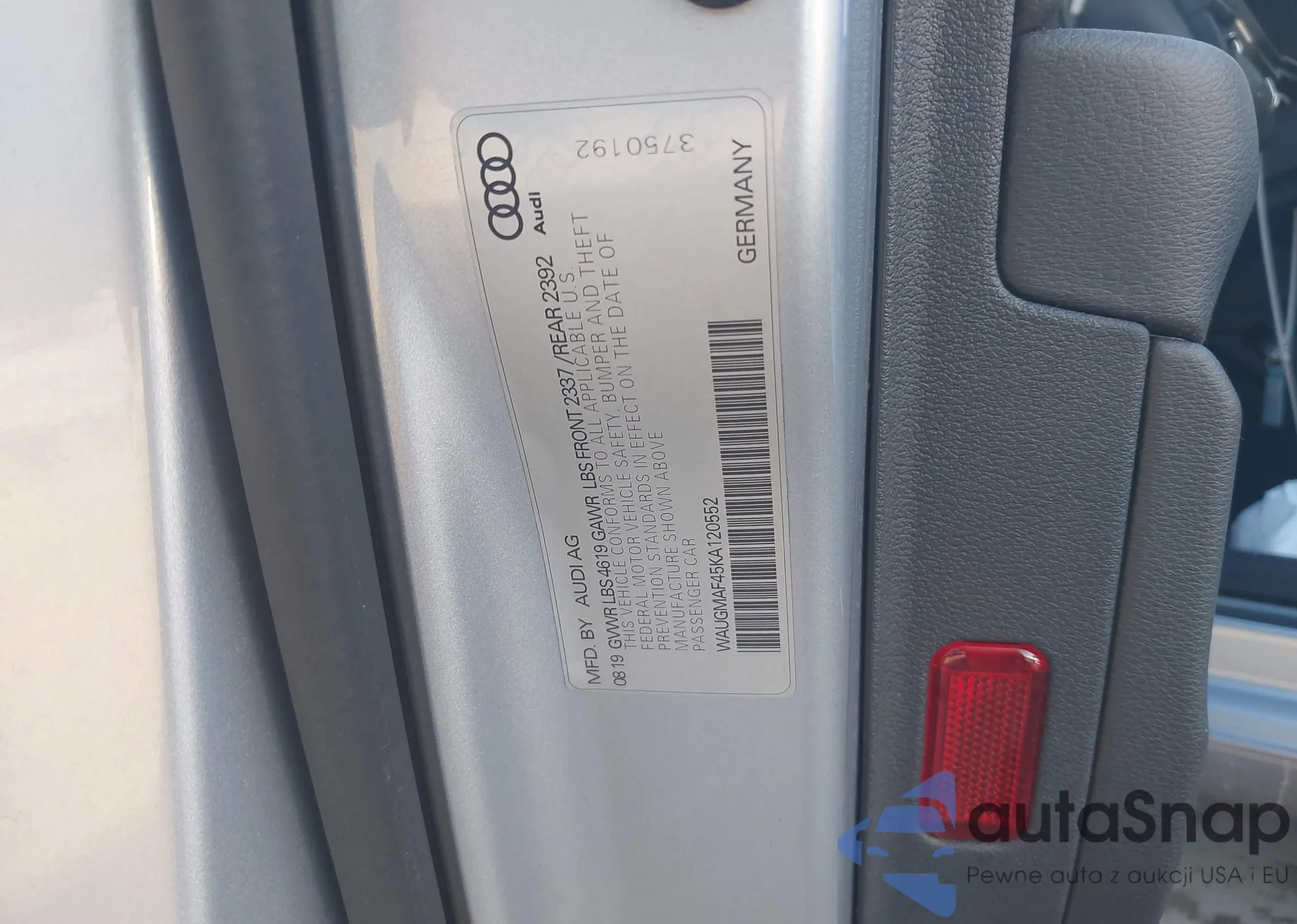 The car Audi A4 2019 (VIN WAUGMAF45KA120552) has not been auctioned before. The documents are clean, and the mileage matches or is below the market average. Sold by an insurance company – we recommend purchase. Delivery to the port will take approx. 6–8 weeks.
