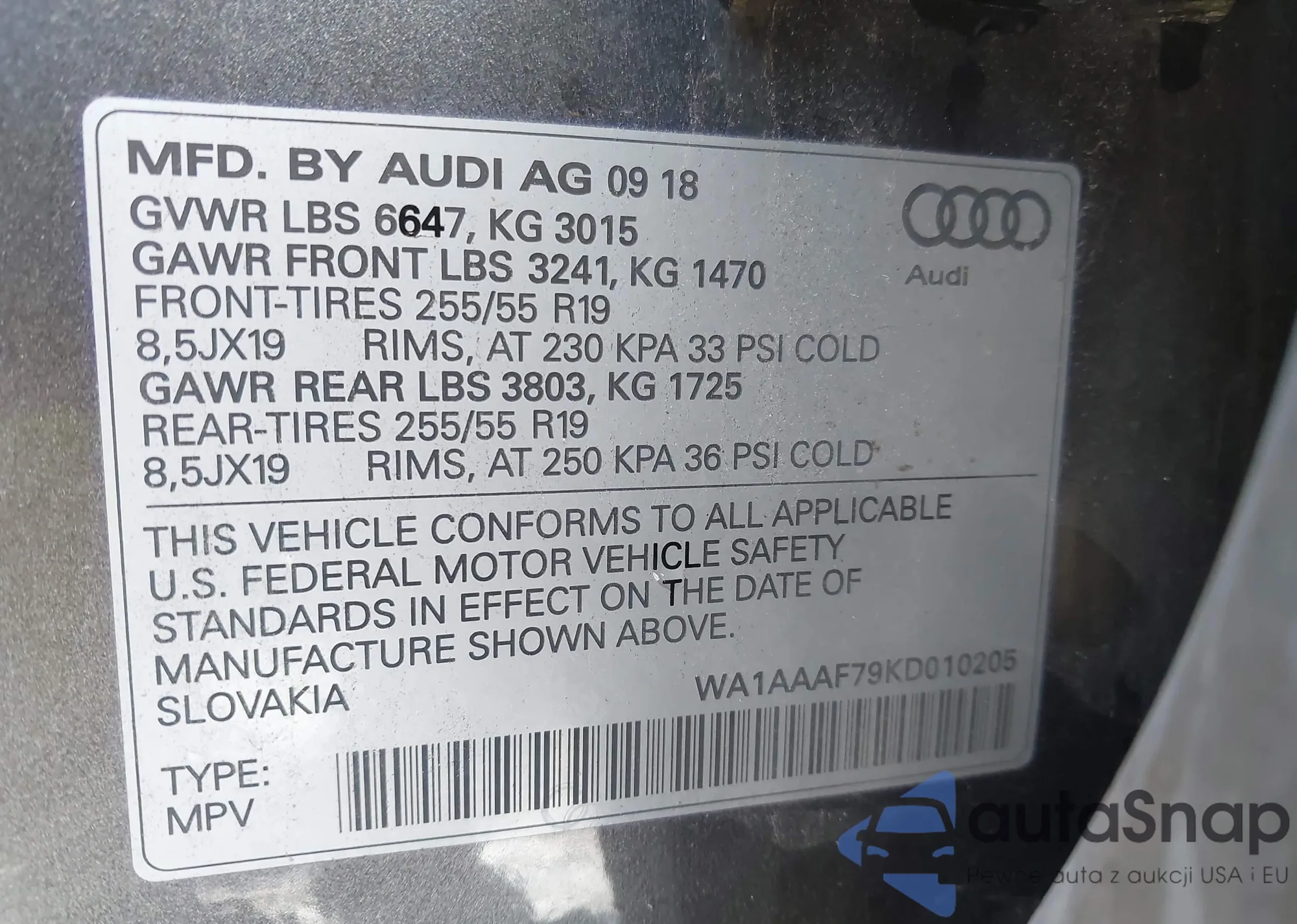 • VIN: WA1AAAF79KD010205