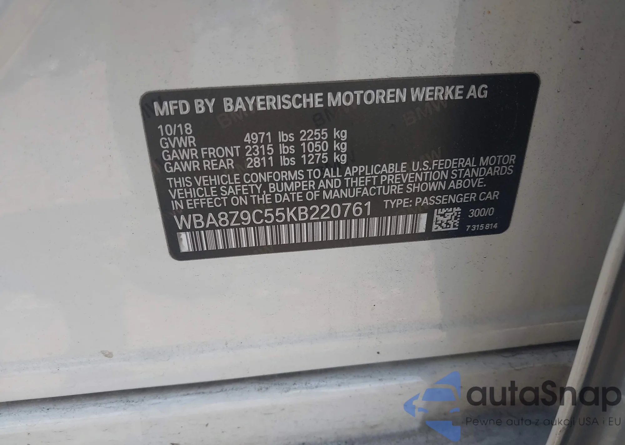 VIN: WBA8Z9C55KB220761