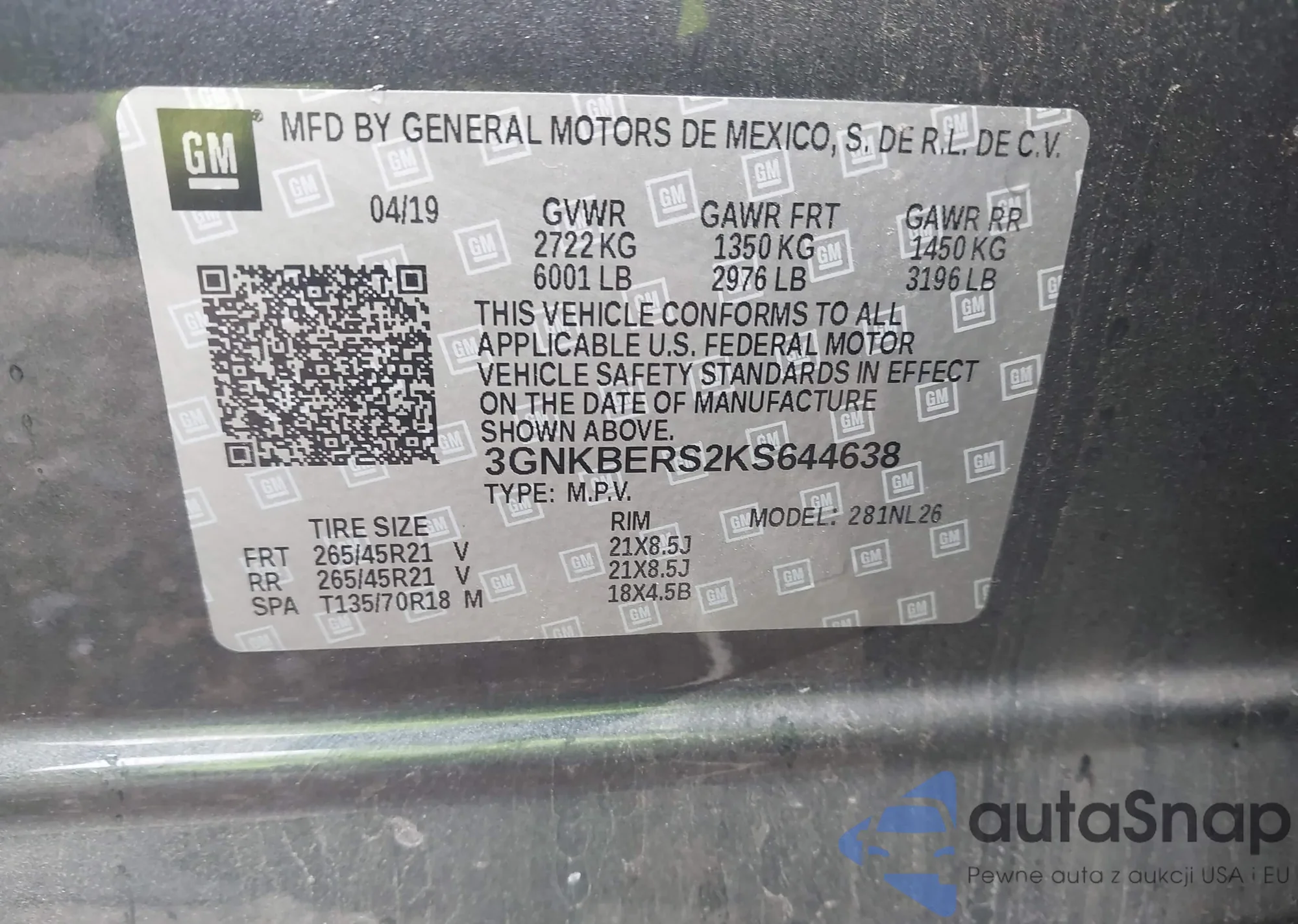VIN: 3GNKBERS2KS644638