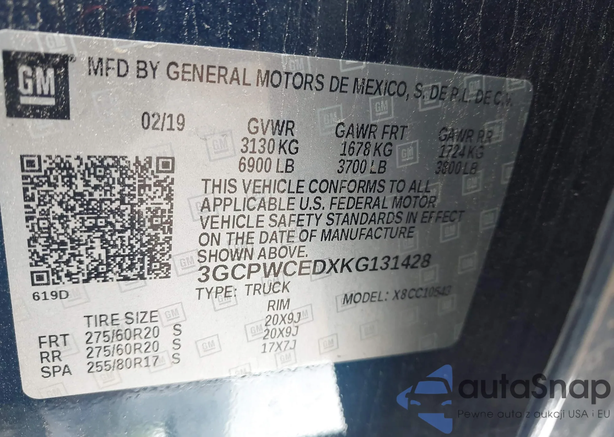 • VIN: 3GCPWCEDXKG131428
