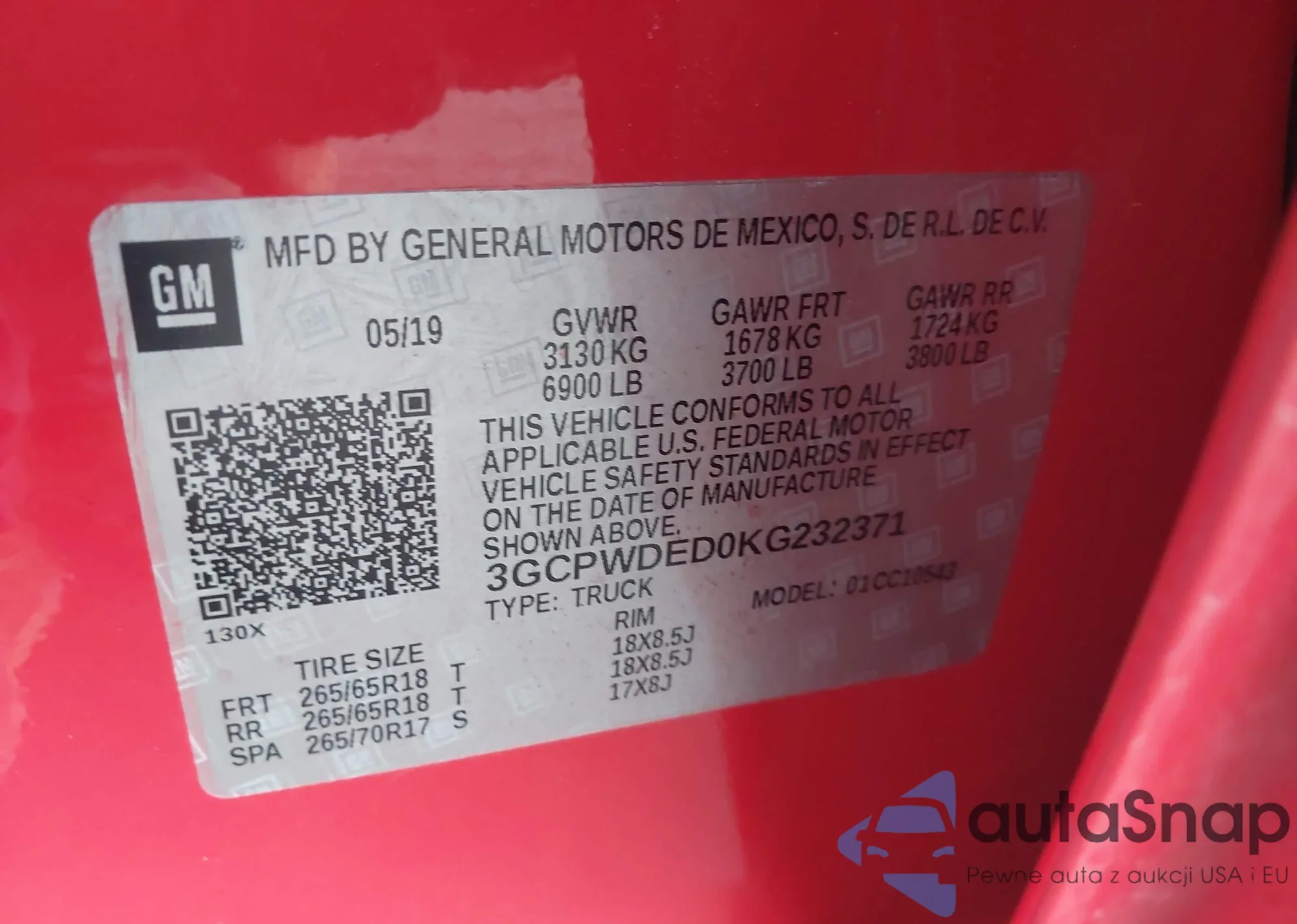 VIN: 3GCPWDED0KG232371