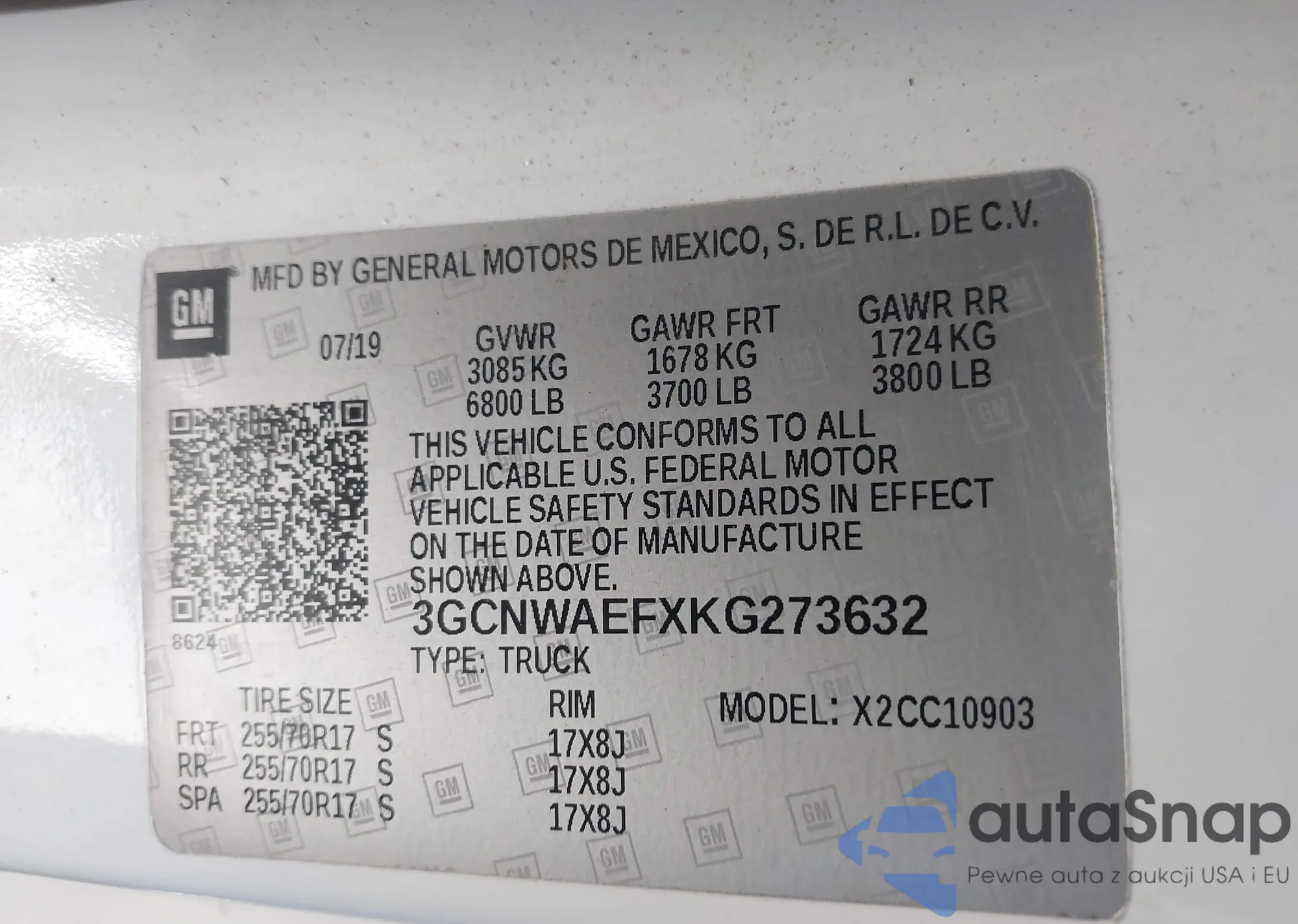 VIN: 3GCNWAEFXKG273632