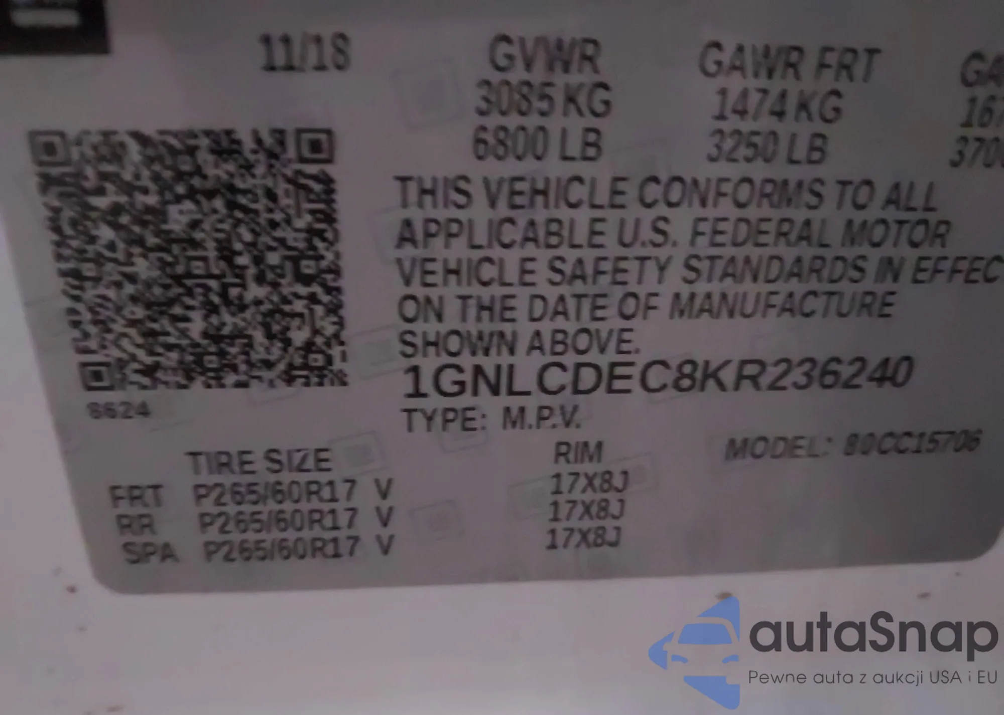 The car Chevrolet Tahoe 2019 (VIN 1GNLCDEC8KR236240) is sold by an unverified seller. We recommend checking the Carfax report and confirming registration possibilities before purchase.