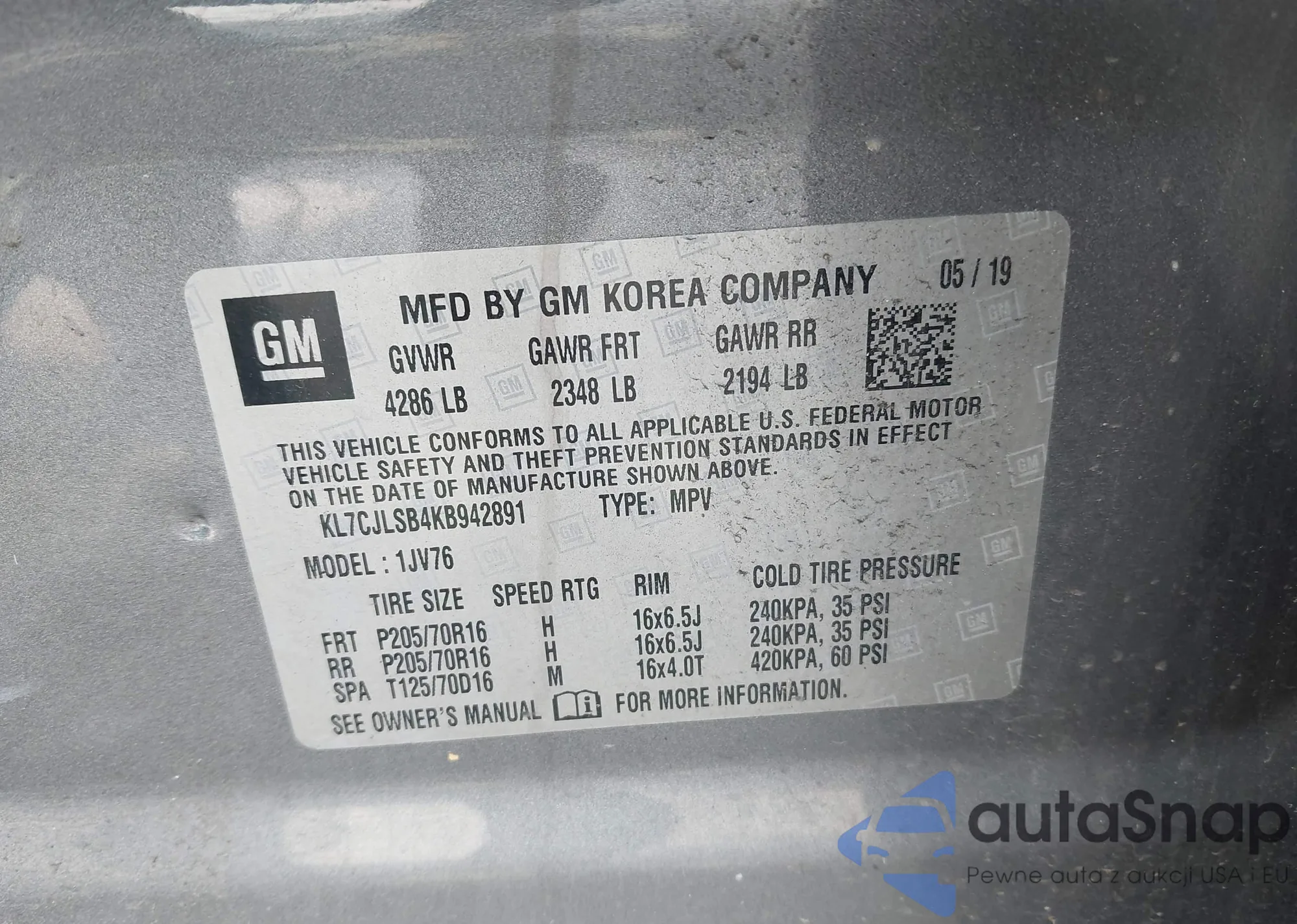 VIN: KL7CJLSB4KB942891